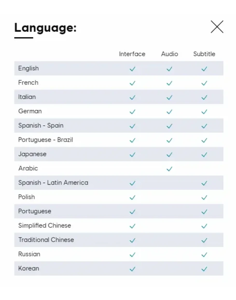 Русский✔ Английский✔ Французский✔ итальянский✔ Немецкий✔ Испанский - Испания✔ Португальский - Бразилия✔ Японский✔ Испанский – Латинская Америка✔ Польский✔ португальский✔ Упрощенный китайский✔ Традиционный китайский✔ Корейский✔