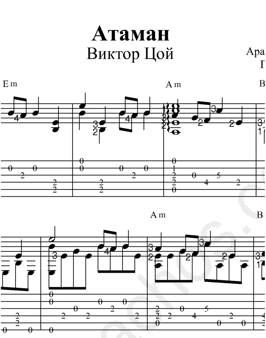 Ноты для одной гитары с аппликатурой левой руки и табулатура к переложению на песню группы Кино "Атаман". Форматы файлов: tiff, pdf, Guitar Pro 5