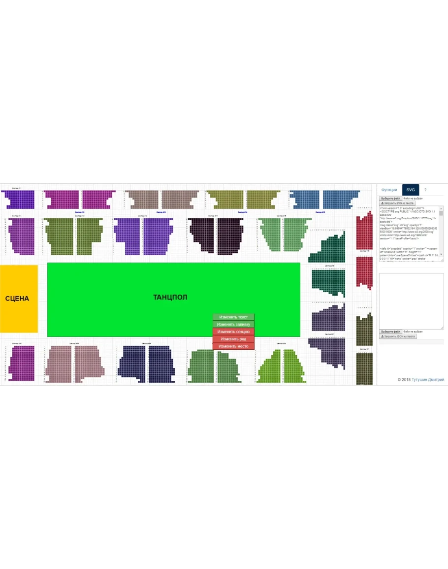 Конструктор с использованием нескольких автоматических решений генерирует схему зала в виде PNG (общей картины), SVG (схема с применением объектам-местам уникальных значений, т.е. например место - ПАРТЕР, 1ряд, 1 место, будет наименоваться как parter-row1-seat1 и т.д.)