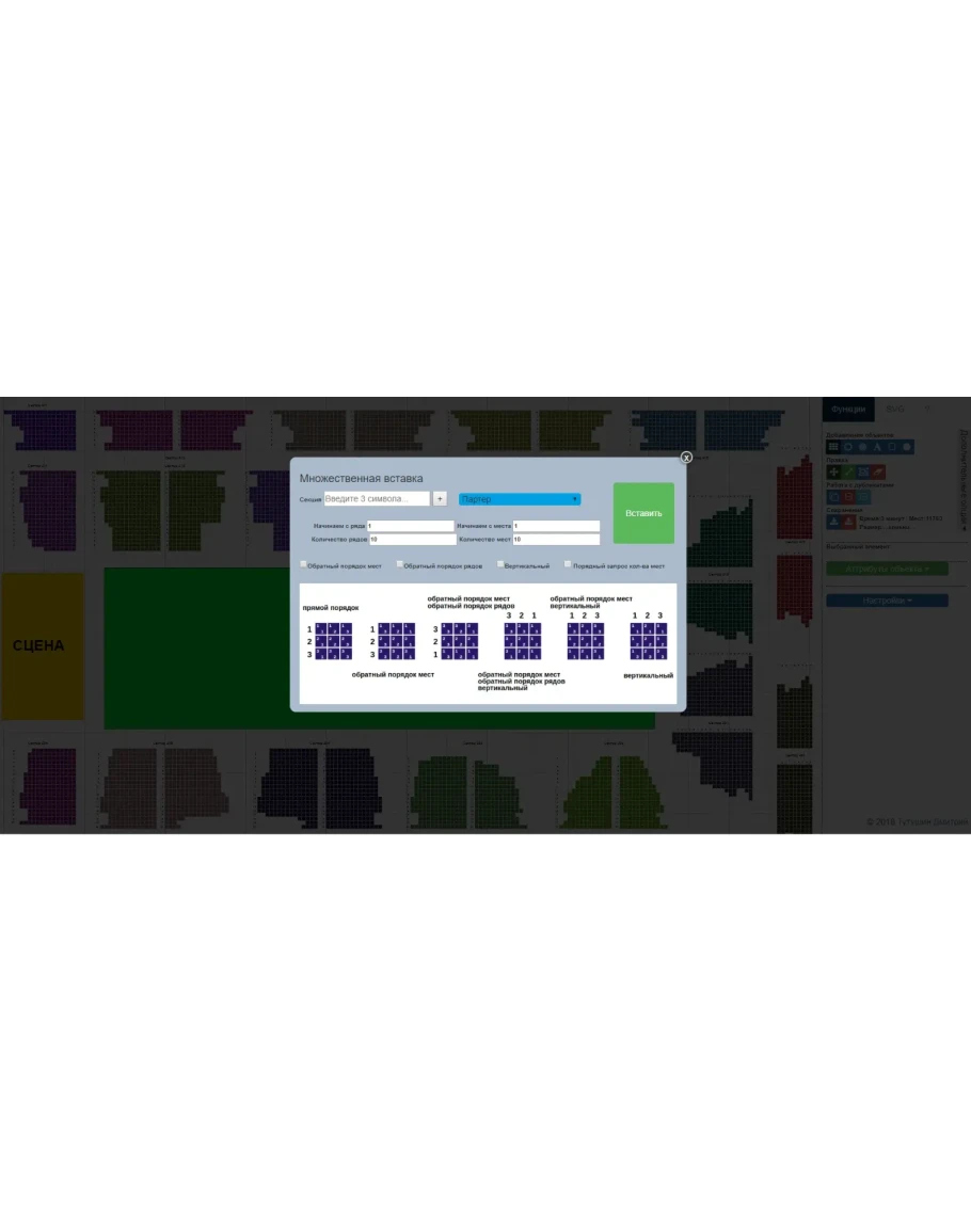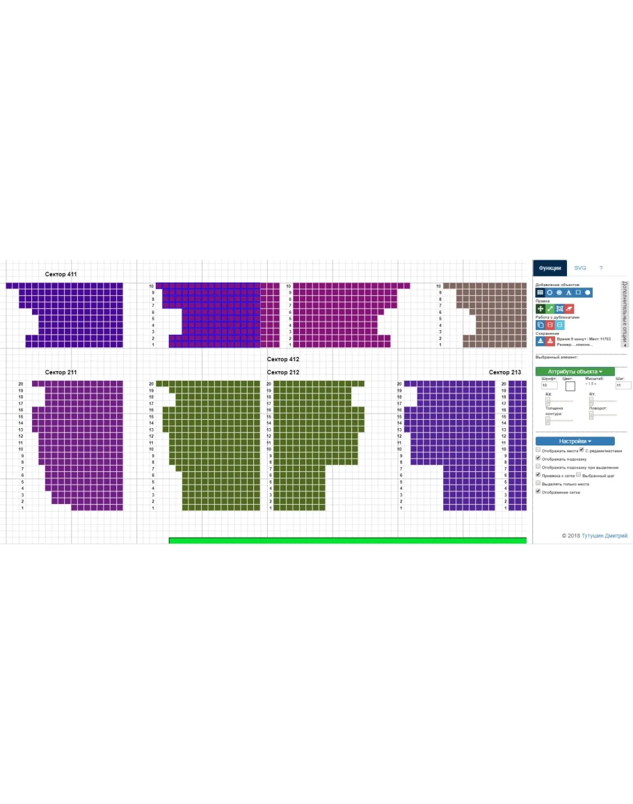 Конструктор схемы залов подойдет для билетных систем, для сайтов театром, концертных площадок и прочих заинтересованных организаций и частных лиц.