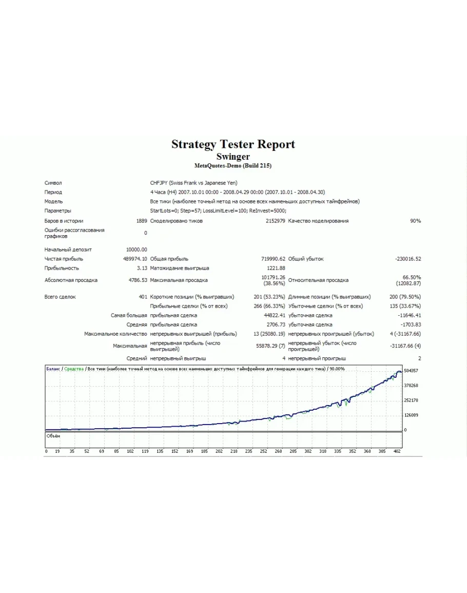 Несколько нетрадиционный подход к вопросу извлечения прибыли: если прежде мы пытлись с переменным успехом предсказать куда двинется цена в будущем, то советнику Swinger это совершенно не интересно - лишь бы двигалась. Всё равно куда. Советник работает на колебаниях рынка по принципу маятника. Собирает профит понемногу и на падениях и на росте цены. Казалось бы всё просто, но алгоритм достаточно сложный. Советник не использует никаких технических индикаторов, данных ФА и ТА, в основу его положена математическая статистика.