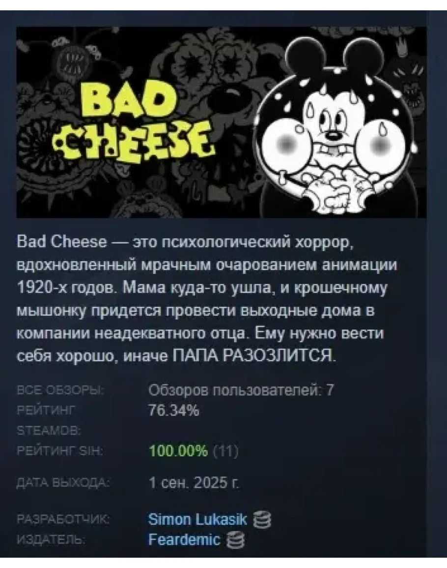 Bad Cheese — это психологический хоррор, вдохновленный мрачным очарованием анимации 1920-х годов. Мама куда-то ушла, и крошечному мышонку придется провести выходные дома в компании неадекватного отца. Ему нужно вести себя хорошо, иначе ПАПА РАЗОЗЛИТСЯ.