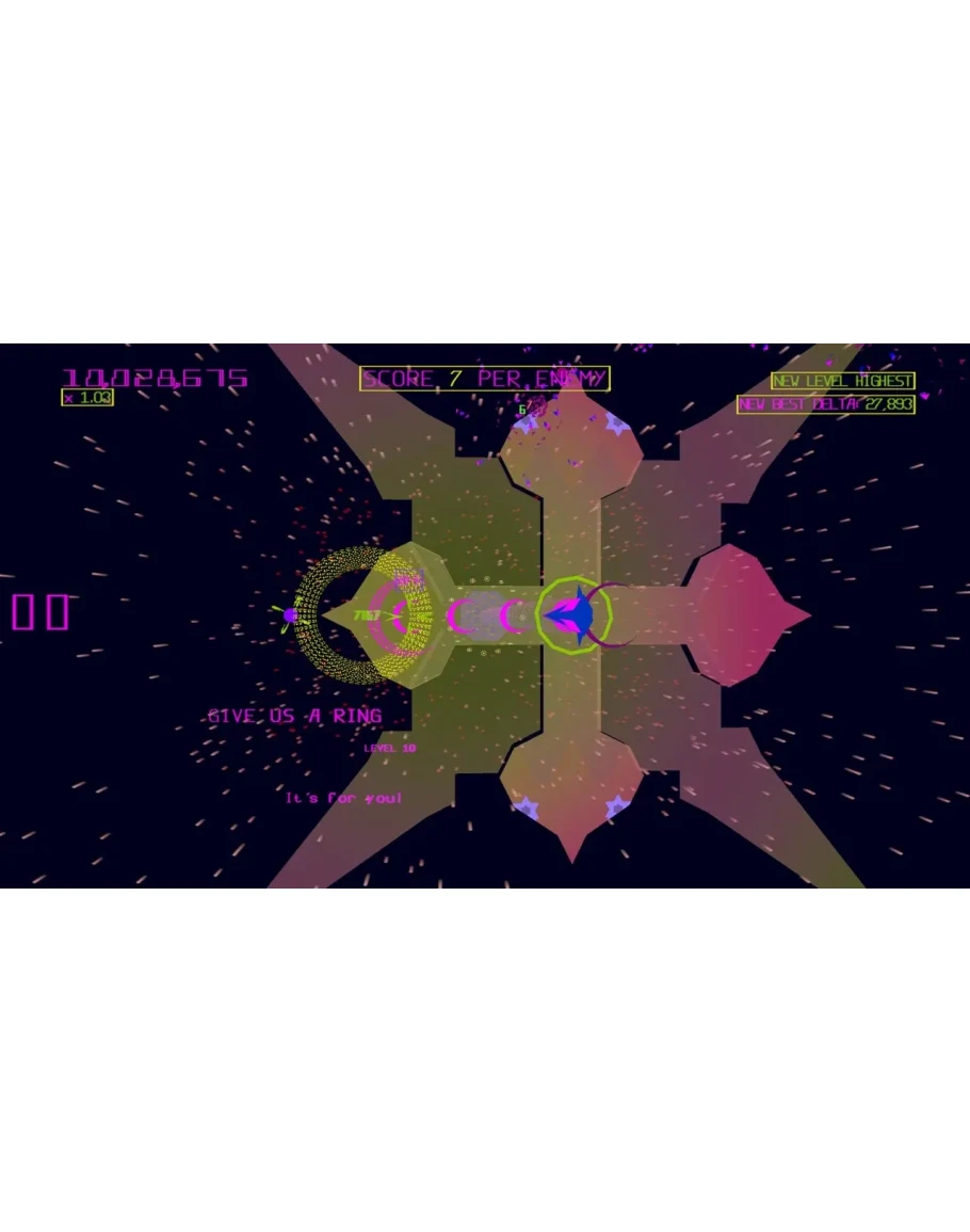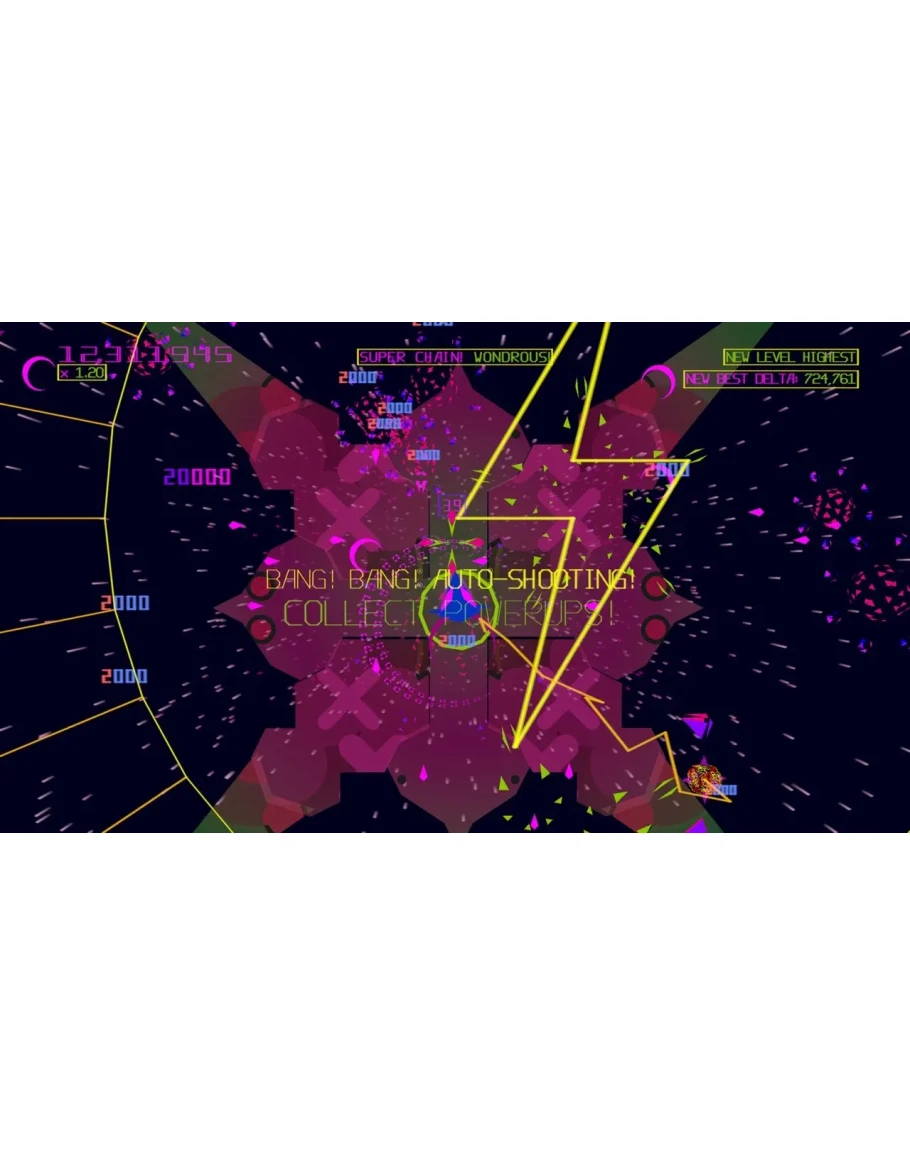 A cascade of words, color, shapes and sound flows around your turret as you desperately fight off swarms of inbound attackers. If enemies penetrate your perimeter you need to zoom into close range combat and beat them back, adjusting to a completely different perspective in the blink of an eye. Welcome to Jeff Minter’s Akka Arrh.