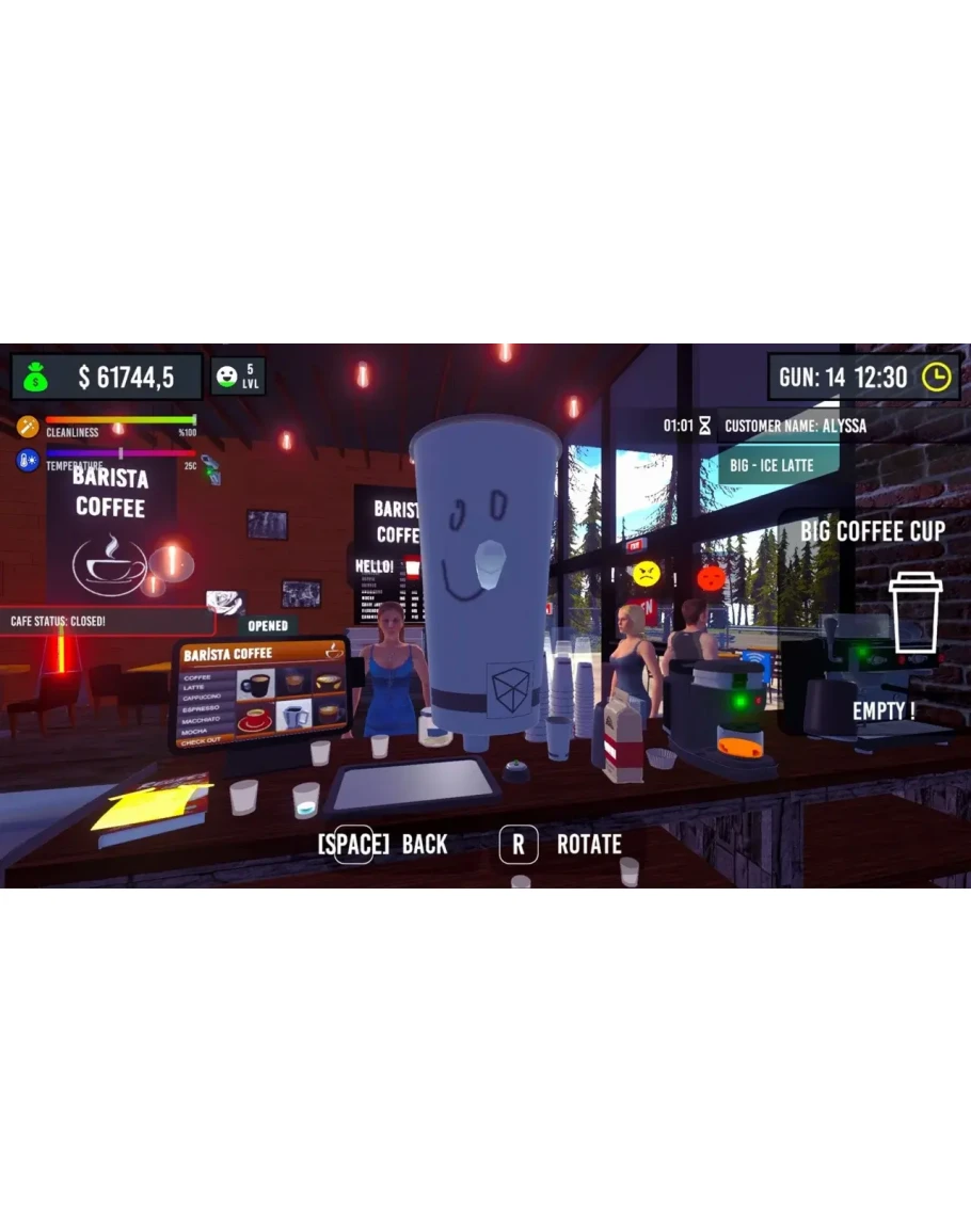 Погрузитесь в мир Barista Simulator. Начните с азов и научитесь готовить более 30 видов кофе! Клиентов будет больше, и они будут все требовательнее. Готовьте идеально, запасайтесь кофе, обучайте персонал, расширяйте бизнес, предлагайте услуги. Пройдите от точки с кофе до популярного кафе! Готовы варить, строить и развивать империю?
