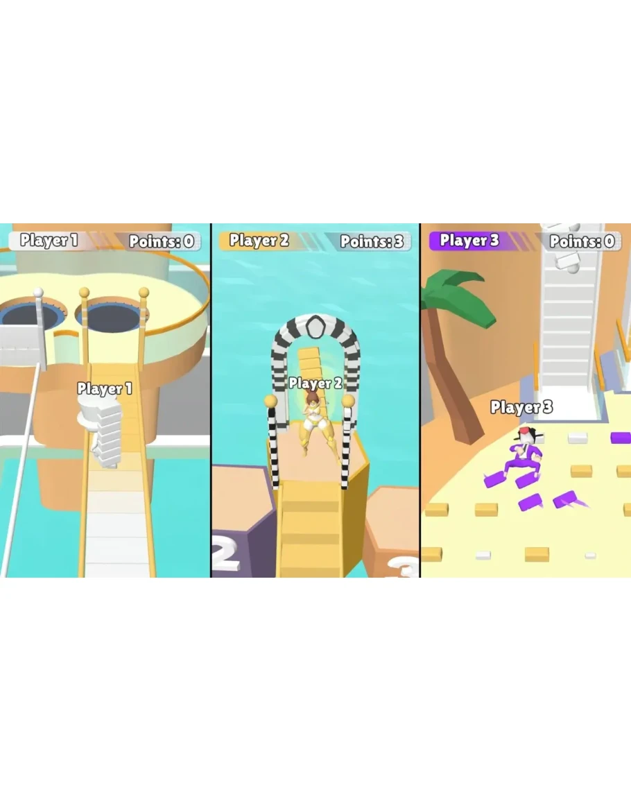 Соревнуйтесь с друзьями в напряжённых сражениях на разделённом экране. Выбирай свой цвет и скин, задавай количество раундов и докажи свои строительные навыки. Зарабатывай очки за каждый финиш и следи, кто взойдёт на вершину таблицы. Готов побеждать?