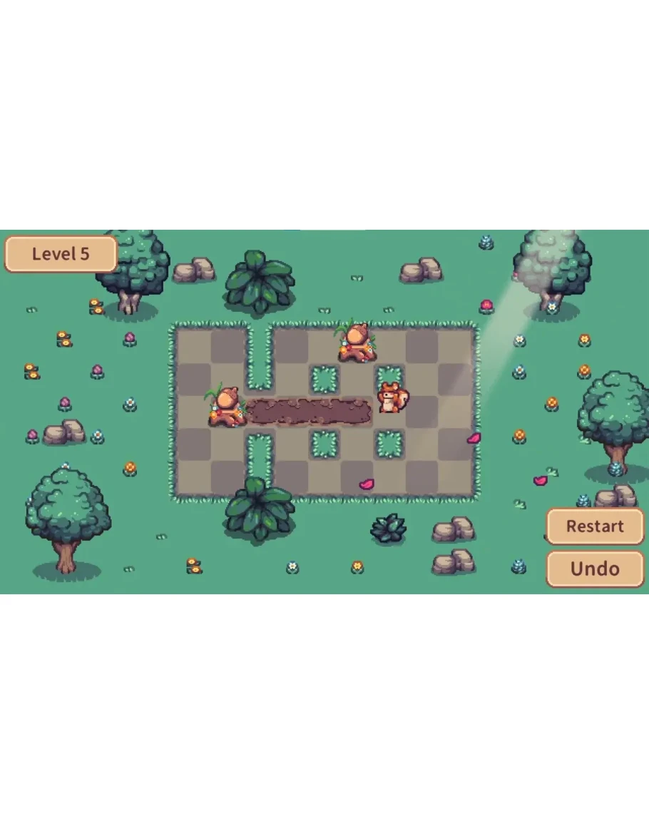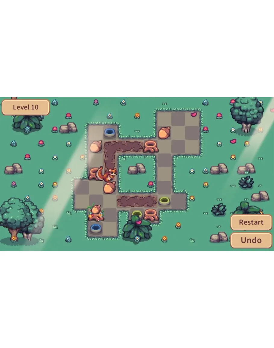 На каждом уровне появляются новые механики, делающие прохождение еще увлекательнее: грязевые плитки, по которым жёлуди скользят, поваленные стволы деревьев, перенаправляющие движение, и норы, телепортирующие жёлуди по карте!
