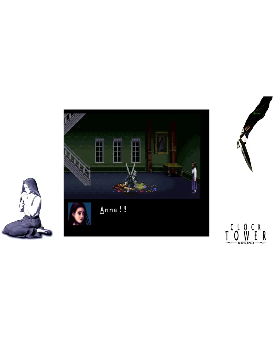 Turn back the clock for one of the pioneers of the survival-horror genre. Translated and released outside of Japan for the first time, Clock Tower: Rewind is a revival of the terror-inducing 16-bit classic that dares you to explore the haunting confines of the Barrows family manor. As teenage orphan Jennifer, you must search every disturbing corner to find items, reveal secrets, and discover ways to evade Scissorman, a murderous, unstoppable, shears-wielding psychopath.
