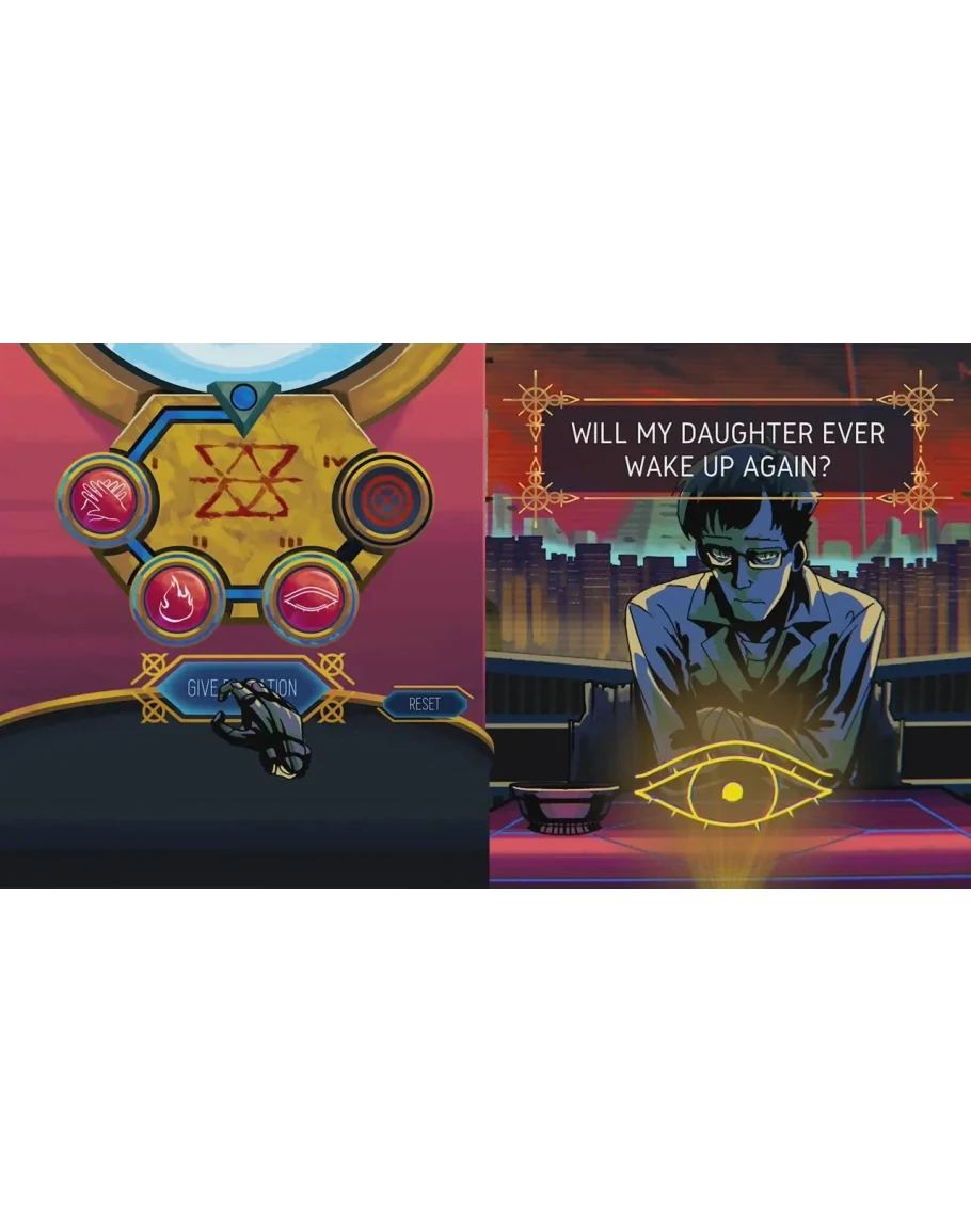Внутри комнаты, полной экранов, находится пара рук, способных предсказывать будущее. Задайте вопрос и вытяните руны, и эти руки откроют вам грядущее. Это будущее, в котором вы живете, маленький мир, город, полный неуверенности и сомнений, насилия и одержимости. В то время, когда люди начали отвергать жизнь как ненужное бремя, им не на что положиться. Они придут, они будут искать, и вы дадите им ответы.