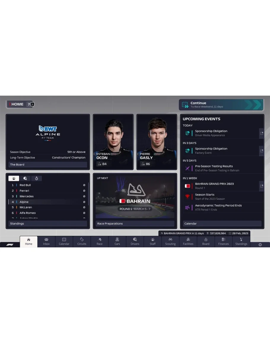 F1® Manager 2023 дает возможность управлять командой F1® так, как хочется вам. Начните свою карьеру в роли директора одной из 10 команд F1® и погрузитесь во все тонкости автоспорта — от производства компонентов до работы в гараже и выбора места на стартовой решетке.