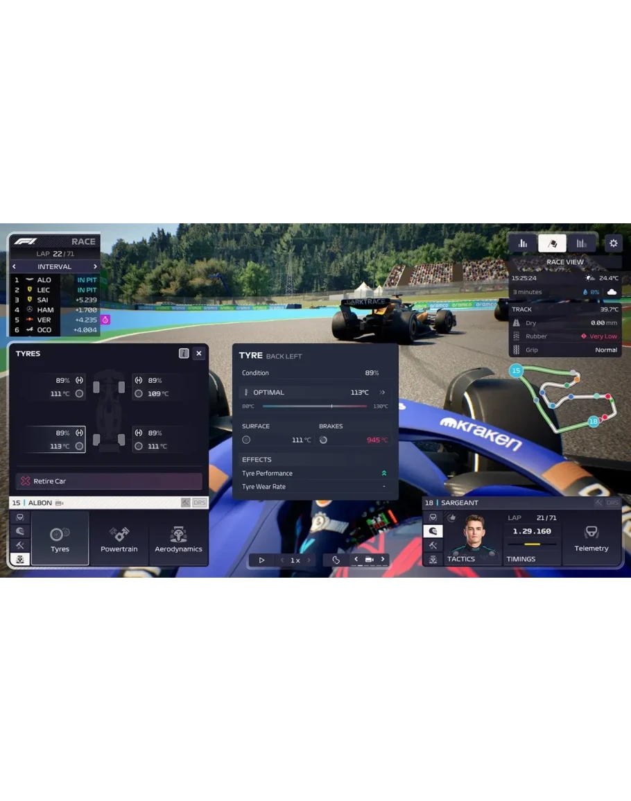 Зрелищные повороты, обгоны и крушения на трассе делают гонки динамичными и запоминающимися. Продвинутый искусственный интеллект, решения команд соперников и улучшенная симуляция износа шин откроют новые испытания и добавят гонкам F1® еще больше реализма.