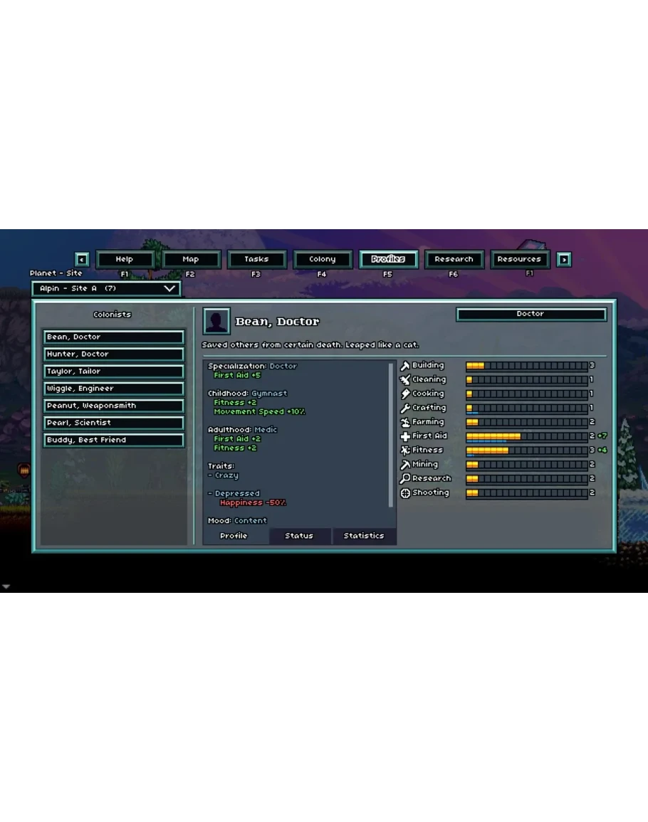 Автоматизируйте свои задачи и сколотите команду. Даже здесь, на далёкой планете, вы не одиноки. Примите других колонистов к себе и постройте базу вместе. У каждого есть свои уникальные характеристики, преимущества и недостатки, которым найдётся применение. С каждым выполненным поручением они будут повышать свой уровень и становиться умнее, сильнее и быстрее. Что самое приятное, им можно поручать всю грязную работу и распределять задачи с учётом способностей каждого. Устали добывать ресурсы и теперь хотите заняться инопланетным подземным гнездом? Пусть колонисты разберутся со всем за вас!