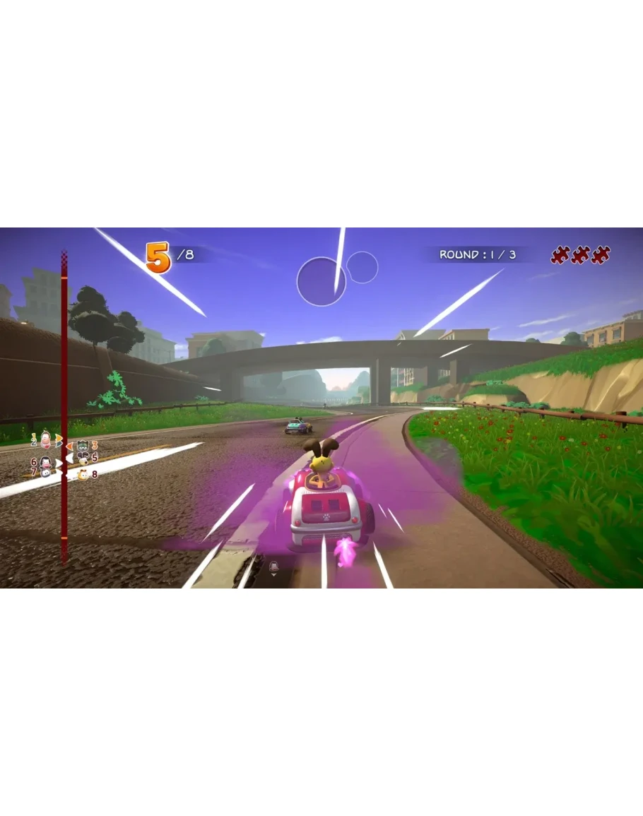 Выбери своего персонажа и карт в соответствии с их характеристиками и твоим стилем вождения, стартуй первым и контролируй заносы, чтобы обогнать соперников. Используй безумные бонусные предметы, такие как подушка или волшебная палочка, чтобы получить преимущество над противниками и первым пересечь финишную черту. Ты ленив, как Garfield (Гарфилд)? Сэкономь время и обгони всех остальных с помощью пружины!