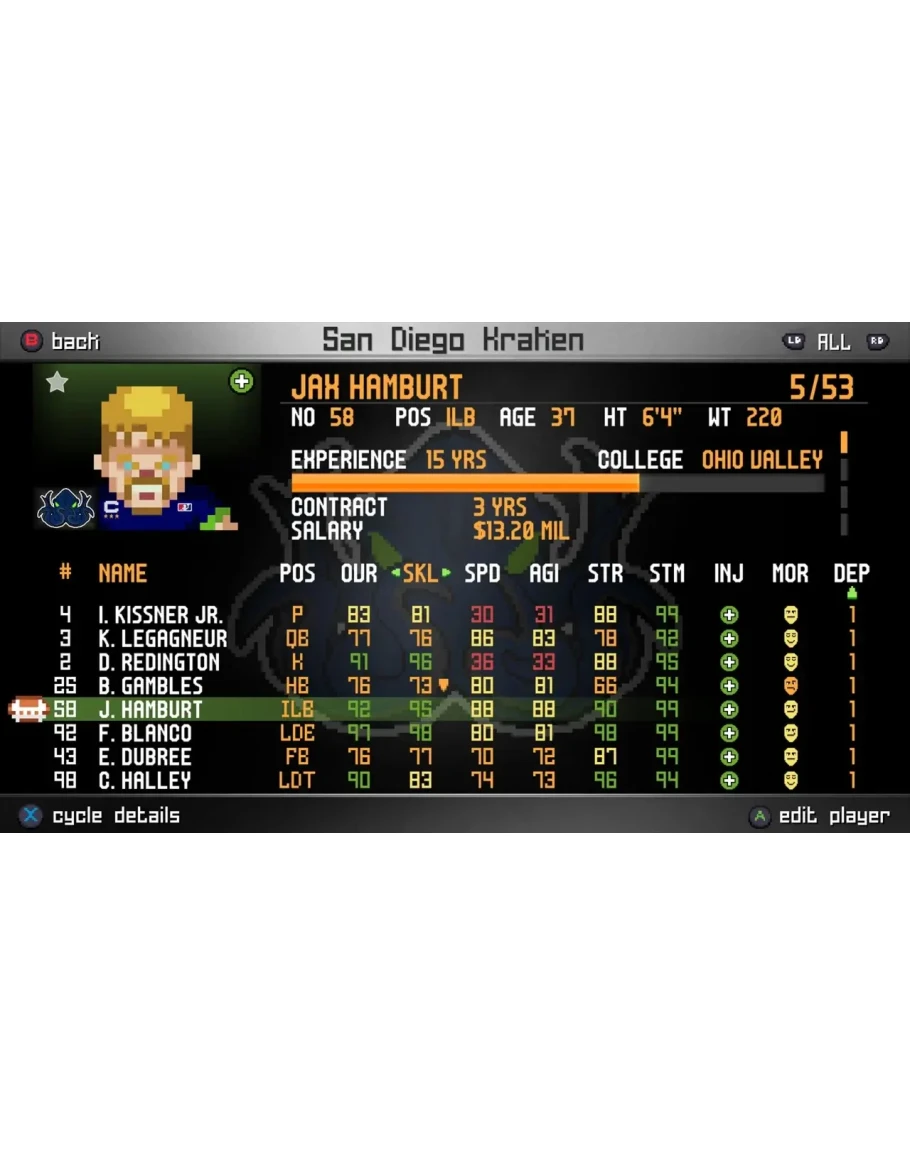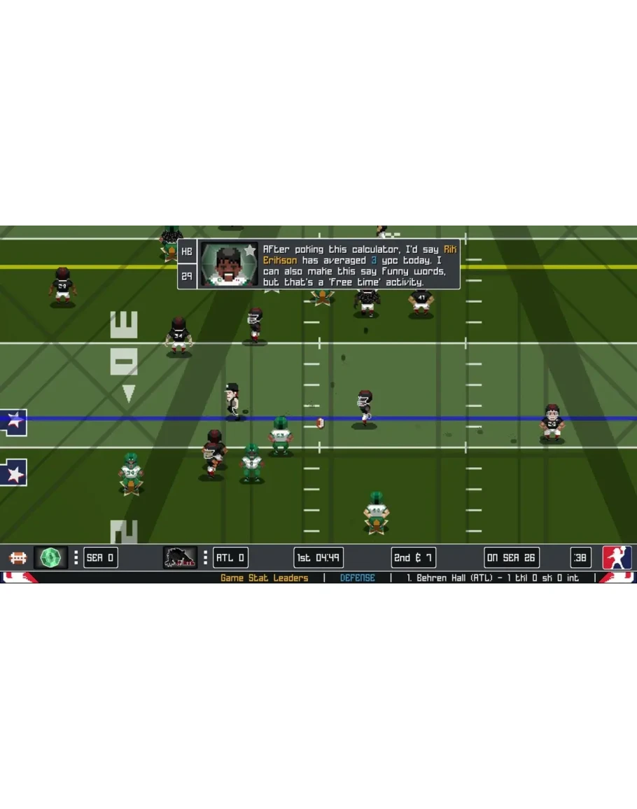 LEGEND BOWL brings you back to the glory days of pixel style football games of the past! Enjoy a hybrid of arcade-style football and simulation aspects on and off the field. Fully customize players and teams to create an endless amount of variety in your league. Take to the gridiron, where sim-based controls with challenging gameplay mechanics bring the fight to your doorstep! Legend Bowl includes Exhibition Mode, Tournament Mode, Franchise Mode, Training Camp Mode, and a boat load of customization options. Will you rise to the top of the Legend Bowl?