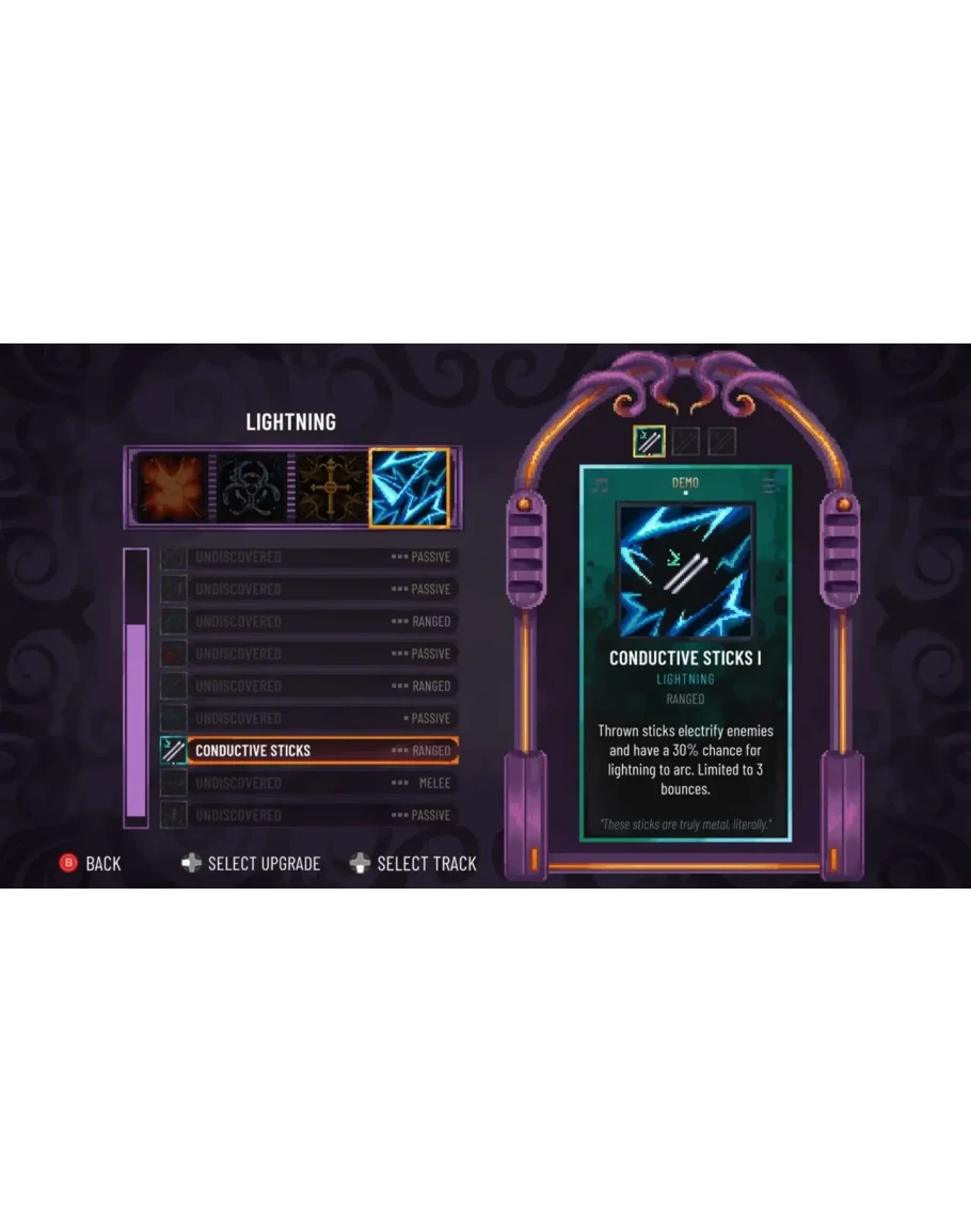 Use the metal band's own music against them by collecting the lost music records found in every level. Choose one of a dark trinity of tracks to add to your playlist that will imbue you & your drumsticks with different corrupted powers.