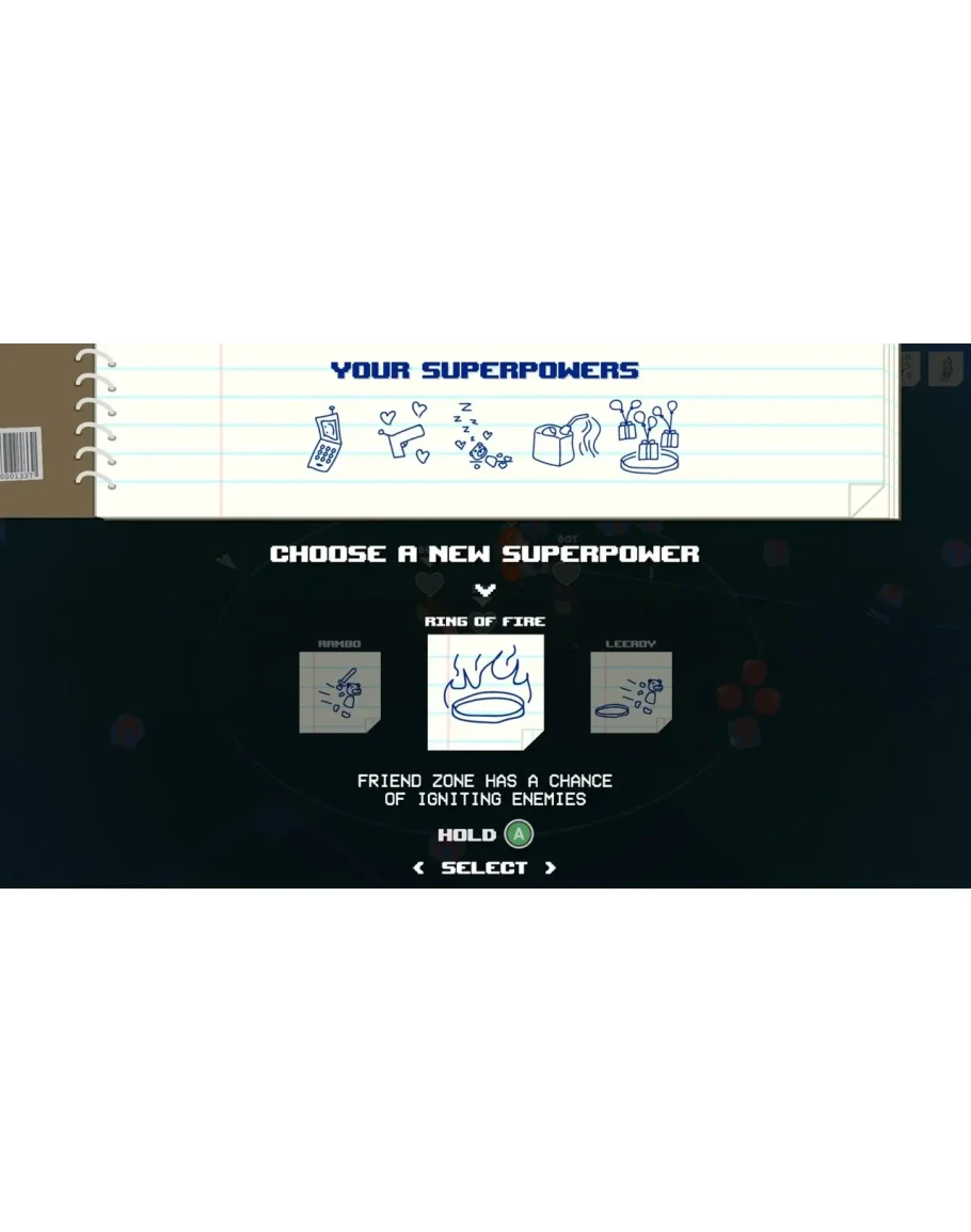 You think to yourself, "No baddie can stop me now!" However, as you get stronger, so does the horde of spooky enemies. Each night you'll face a randomly-selected but ever-increasing combination of enemies including goop-tossing Lunch Ladies, magic-blasting Wizards, and axe-wielding Abe Lincolns. As you're bashed apart by the onslaught of baddies, you realize the only way to survive is the power of friendship; staying close to your team in the Friendzone is the only way you'll regain your health.