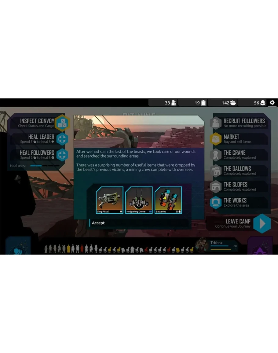 During travel you navigate across a procedurally generated map. Make sure your convoy has enough resources to travel as you pick your route. On your journey you will encounter strange places and even stranger people. You will be thrust into situations that put the fate of your followers in your hands.