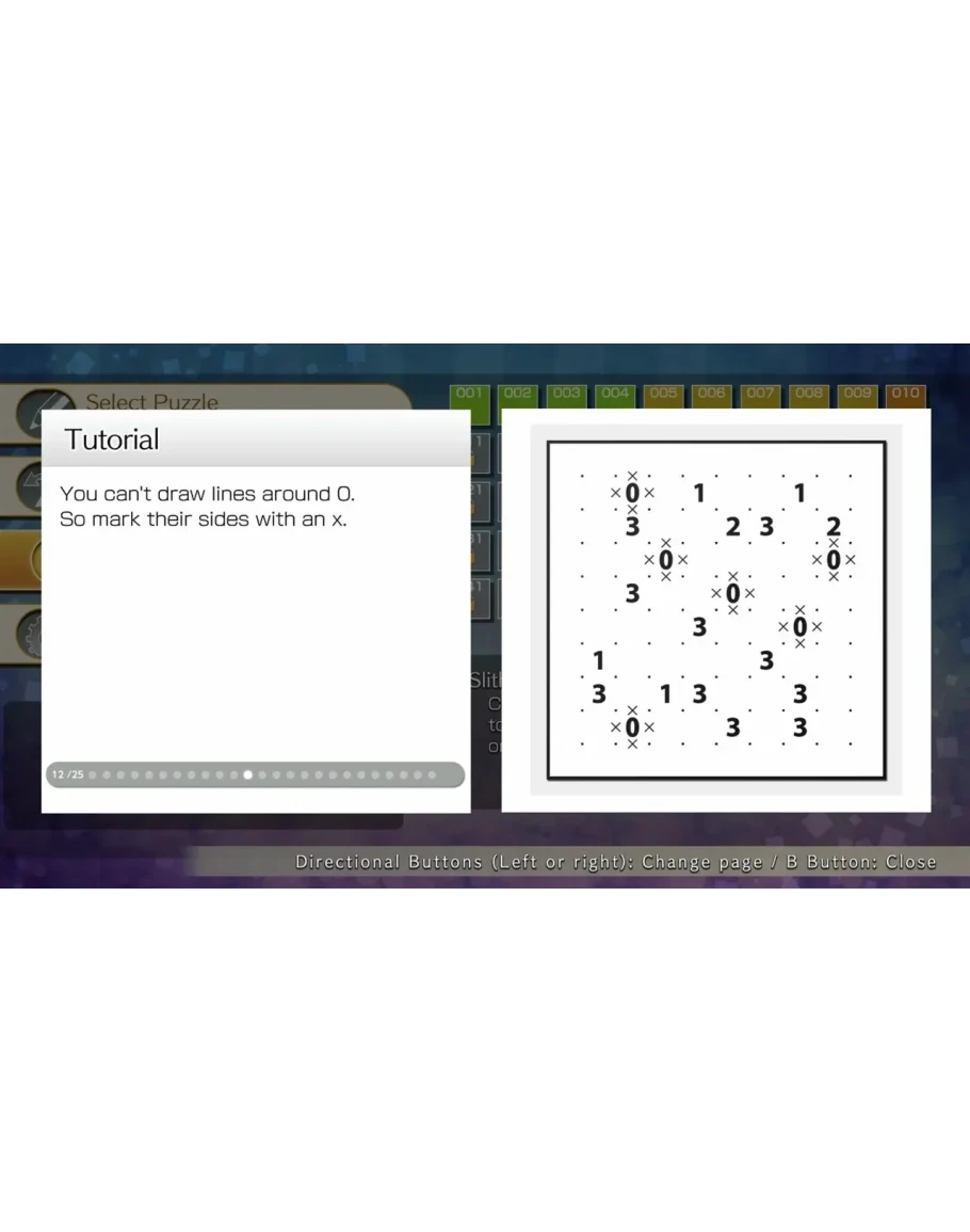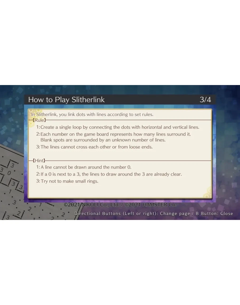 In this - one of Nikoli's most awesome original puzzles - you connect the dots to make a single ring. "Slitherlink" is a puzzle in which you connect dots with a line according to the rules. The greatest attraction is the fact that there exist an unlimited number of set sequences known as "theorems". With this puzzle, you can actually feel your own skill level rising with each theorem you learn.