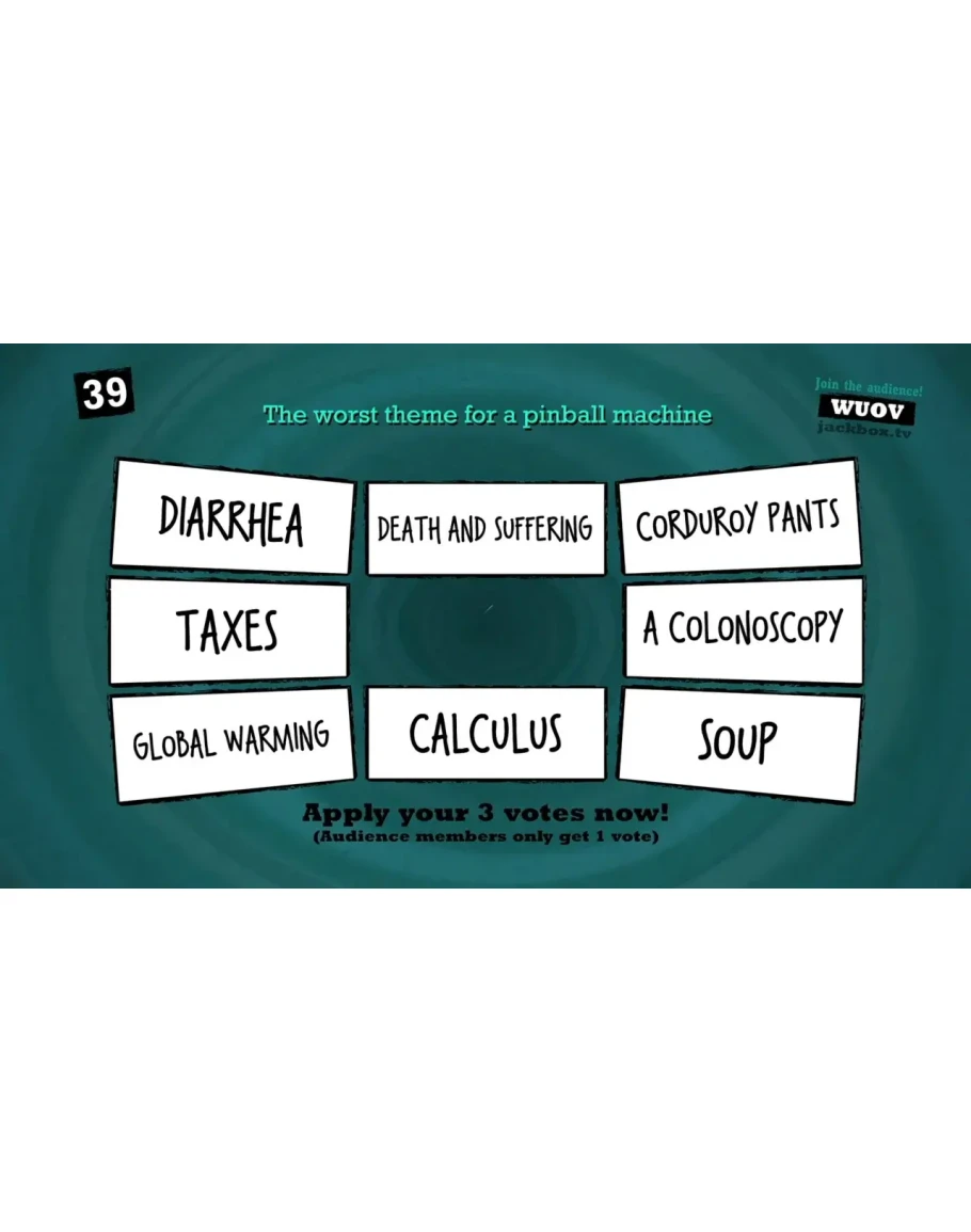 Ваш ответ сравнивается с ответом другого игрока в жесткой схватке на забавность и сообразительность (или, иными словами, «Какой ответ наименее глупый?») другими игроками и даже аудиторией, которая ожидает подключения к участию в следующей игре, - они выбирают самый понравившийся ответ.
