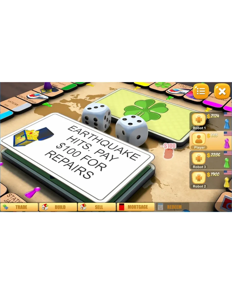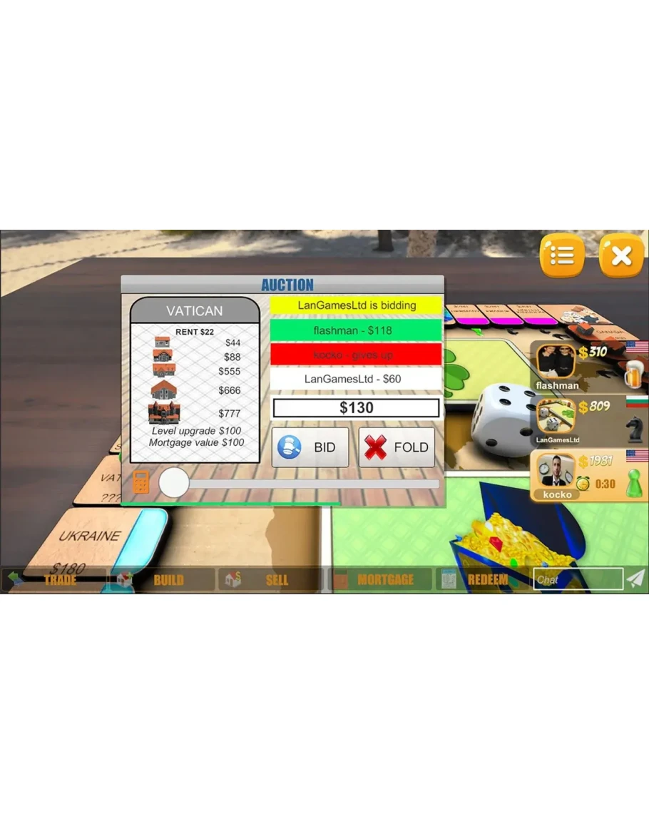 Получите монополию на игровое поле и обанкротите других игроков, чтобы победить.