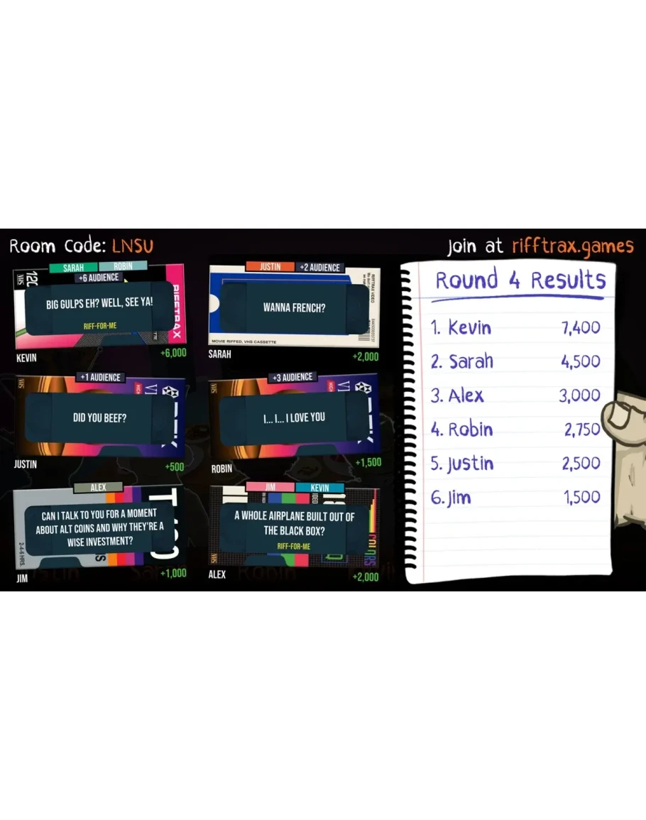 RiffTrax: The Game is a multiplayer party game where players compete to make bad movies funny. Grab your friends and make fun of some of the worst cinematic abominations ever created. RiffTrax has been bringing their comedic commentary to movies for over 15 years - now’s your chance to riff along with them! Do you have what it takes to be the next movie riffing genius?