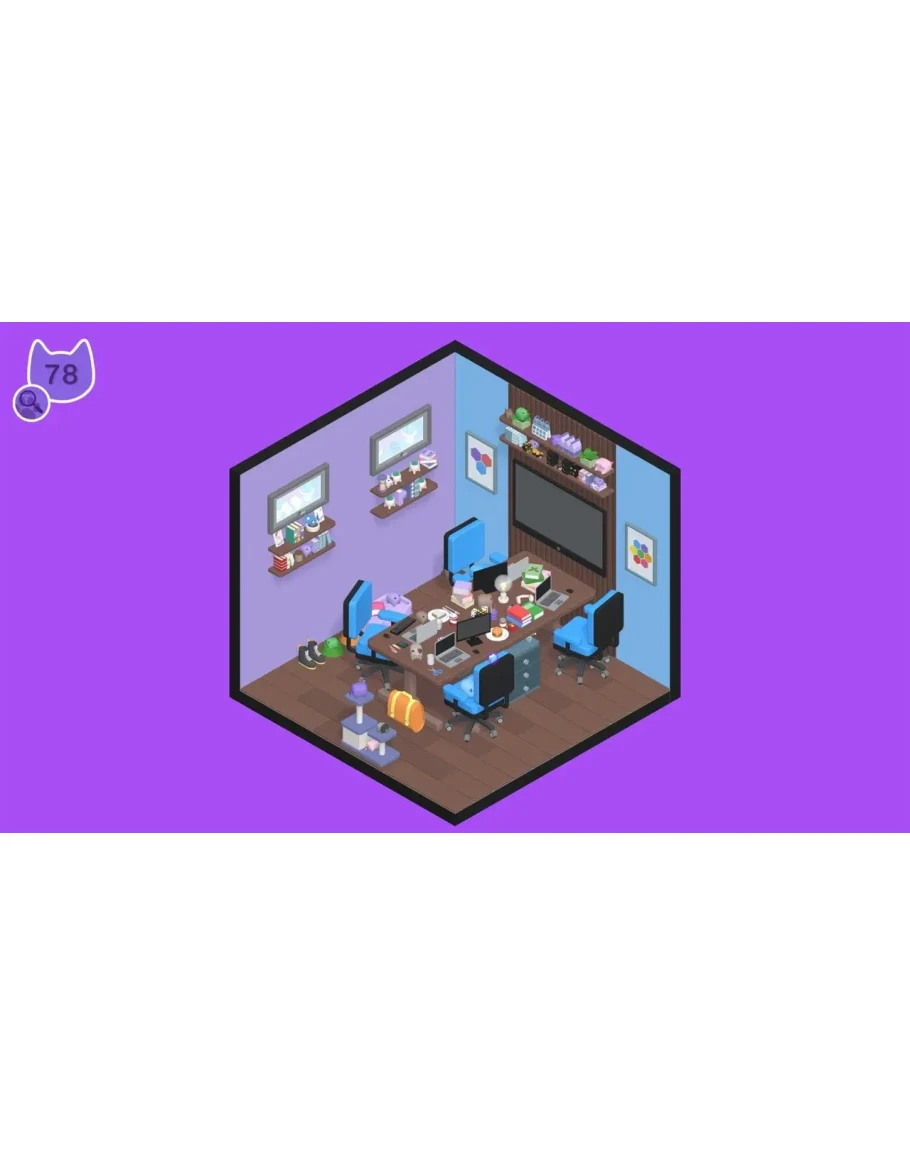 Вращайте комнату, чтобы лучше видеть препятствия, наводите курсор и кликайте на каждую обнаруженную кошку, постепенно обнуляя счетчик в левом верхнем углу экрана. Secret Paws - Cozy Offices — это спокойная, непринужденная и терапевтическая игра с успокаивающим саундтреком, которая станет идеальным развлечением в любое время!