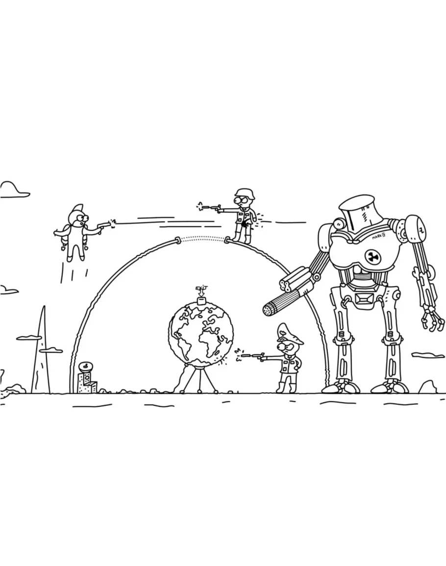 Johnny Rocket gameplay is made of action platforming, stylised as a free-hand black and white cartoon. Cartoon world feels alive and you can destroy buildings. You get to see a funny cartoon cut scene in between levels!
