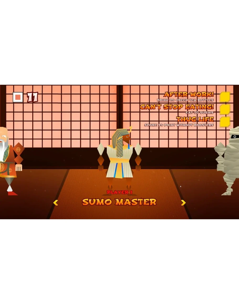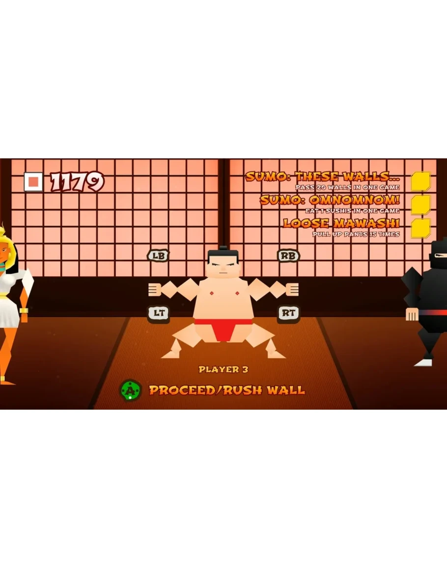 В Tetsumo Party борцы сумо участвуют в необычном конкурсе, основанном на японских телешоу. На них надвигается бамбуковая стена с отверстиями необычной формы, и участники должны в них попасть, иначе... скажем так, они окажутся в довольно смехотворном положении.