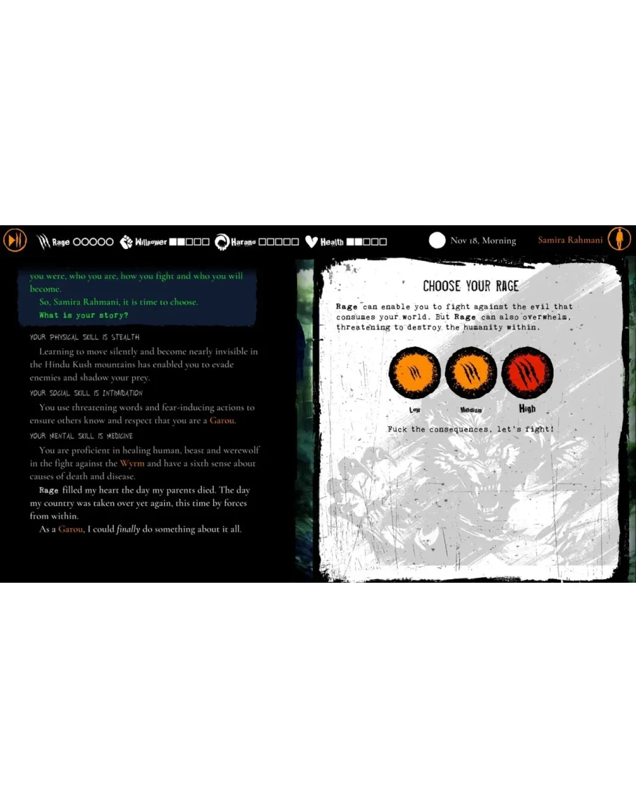 Выберите свой путь: расследуйте сверхъестественное убийство или узнайте секреты могущественной стаи оборотней. Ваши выборы влияют на путешествие Самиры, балансируя её здоровье, волю, ярость и навыки. Вы поведёте её к свету или к тьме?
