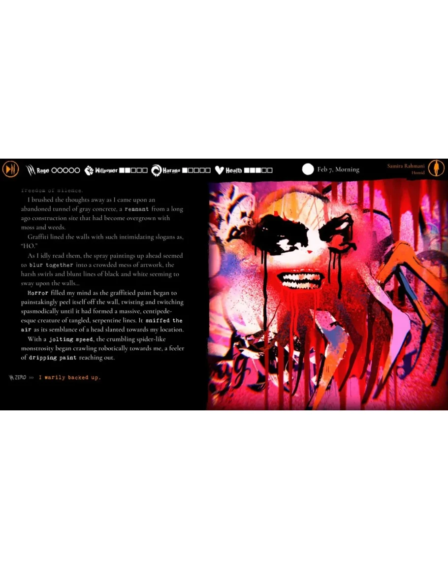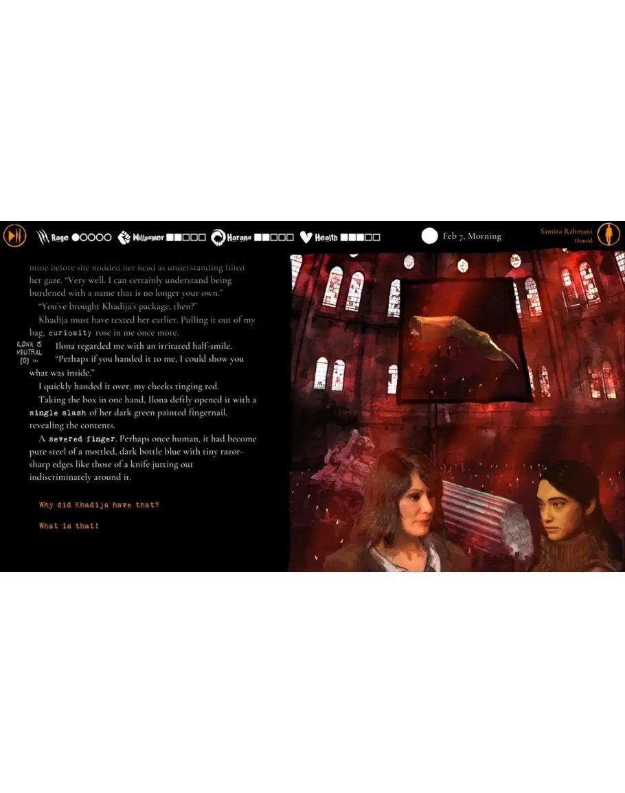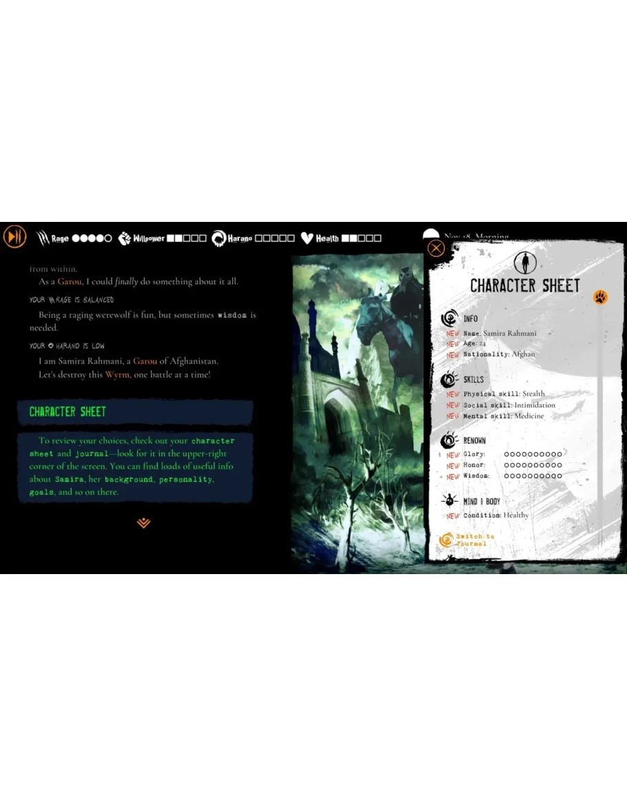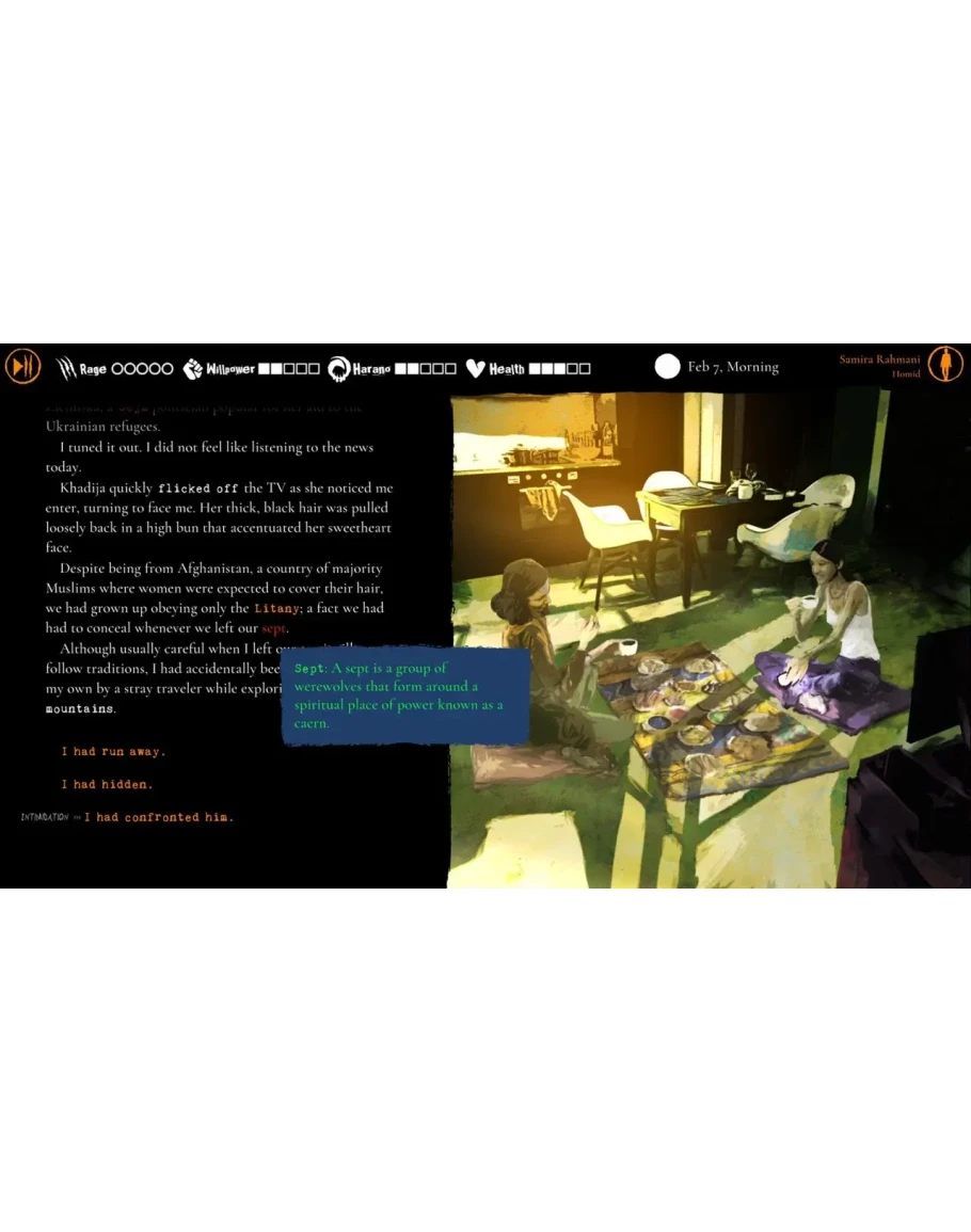 Испытайте сочетание визуального романа и настольной RPG, вдохновлённой легендарным пятым изданием World of Darkness. Управляйте своим инвентарём, овладевайте уникальными навыками и ориентируйтесь в системе харано — отражении внутреннего отчаяния Самиры.