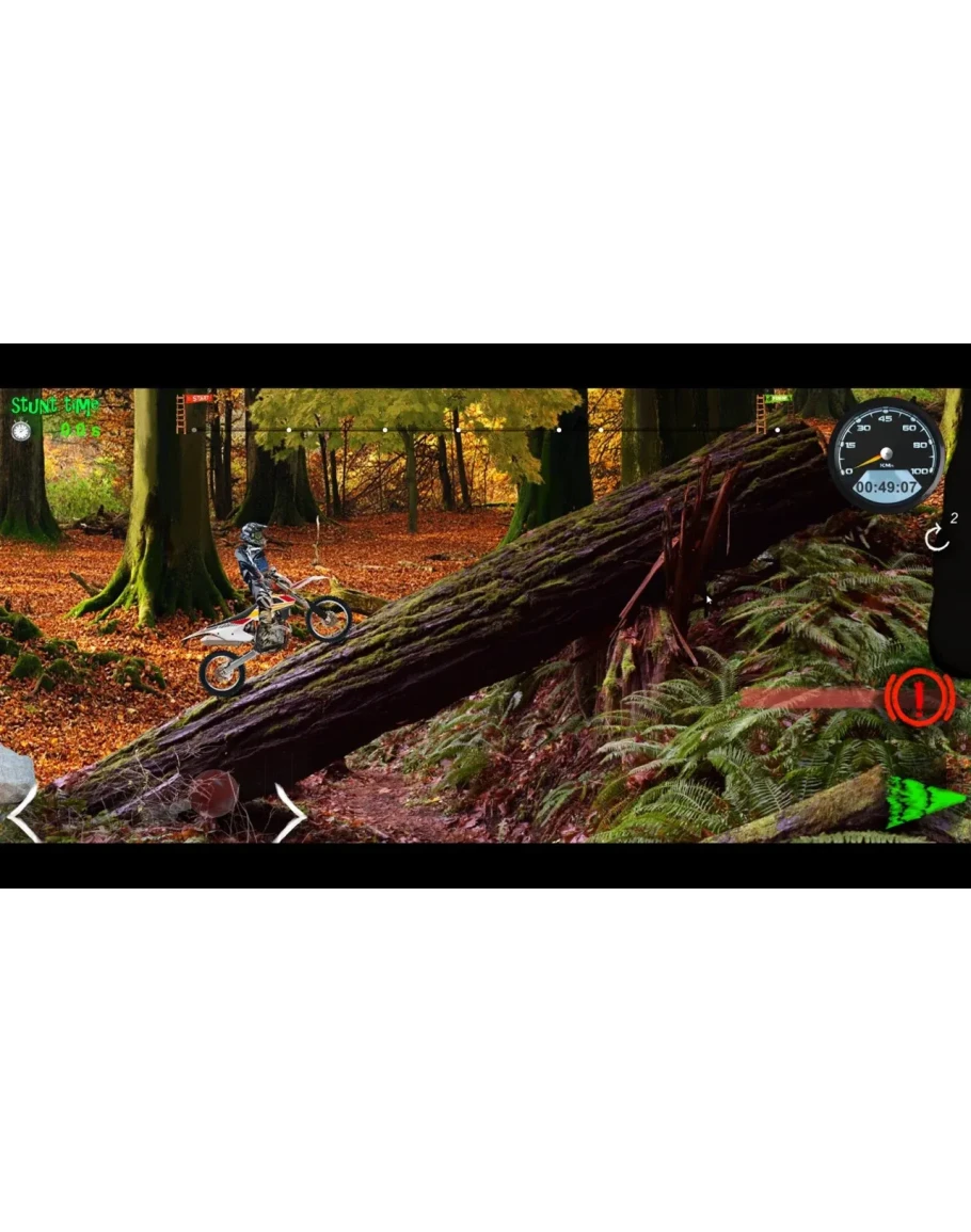 Enduro racing is a somewhere between MX and Trials sports. You ride in outdoor locations on a time-based race. The goal is to complete each round as fast as possible, but World Enduro Rally will give you bonus time if you perform stunts like backflips, frontflips (and other hidden stunts), and will add penalty time each time you re-spawn.