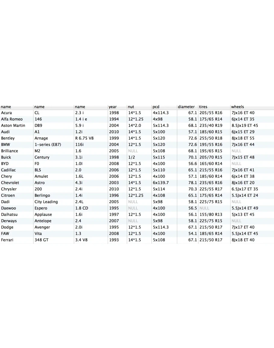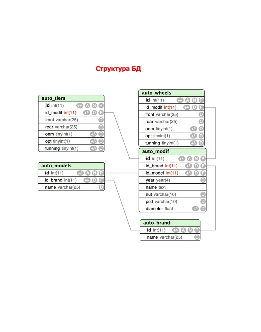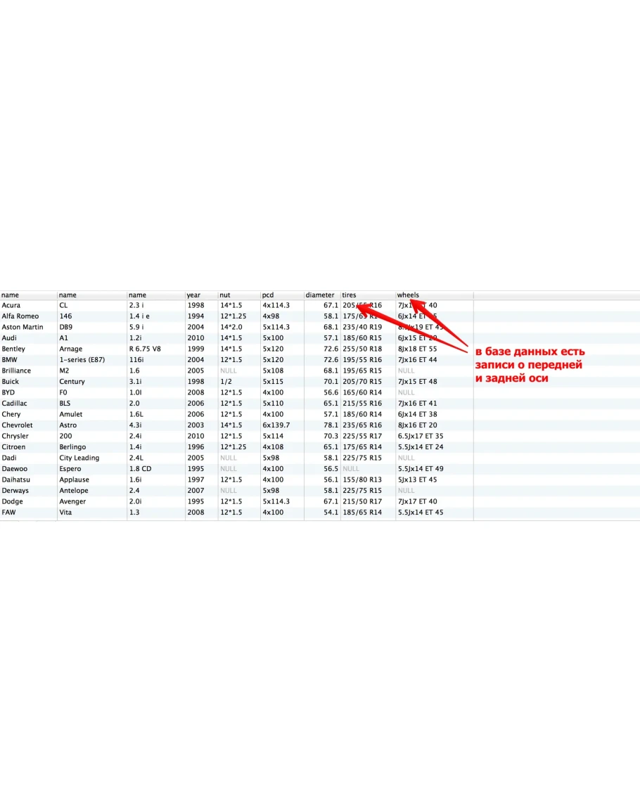 База данных (БД) для подбора шин/дисков по марке авто или году выпуска авто.