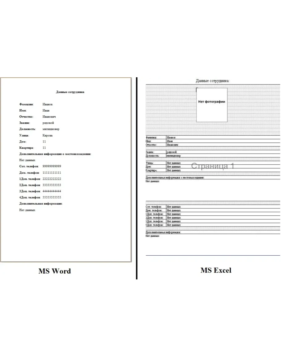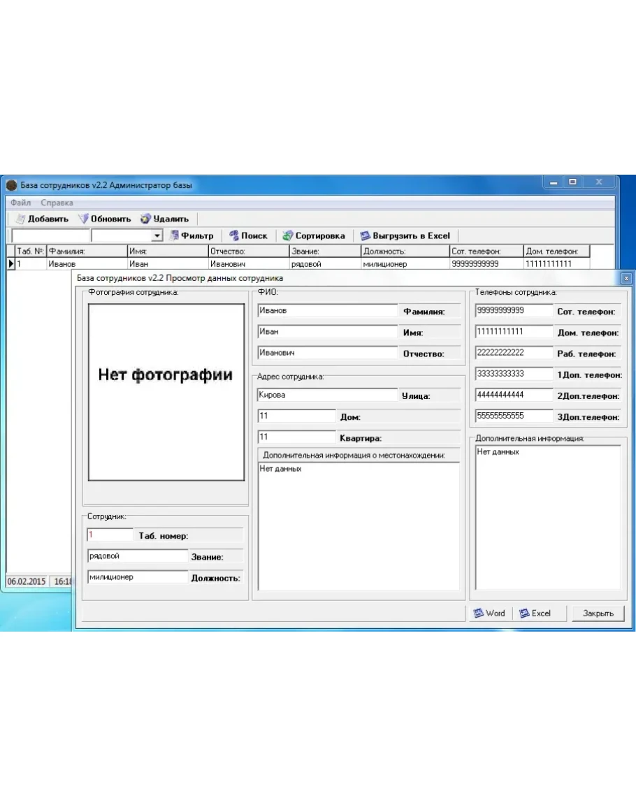 В программе: добавление, удаление и редактирование, вывод данных, работа с MS Excel(вывод данных сотрудников), работа в MS Word(вывод данных сотрудника из шаблона .dot) и т.д.