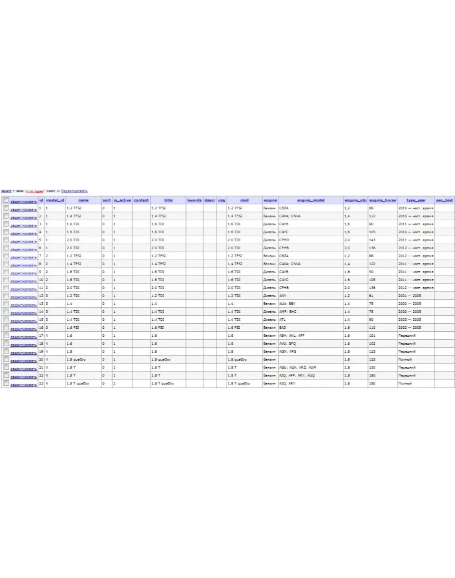 Готовая MySQL база данных запчастей автомобилей (обновлена 06.2015), позволяет сделать подбор запчастей для авто до 2015 г.в. Всего 50775 запчастей для 4126 модификаций авто. С помощью данной базы Вы сможете организовать у себя на сайте каталог расходных материалов с помощью которого можно будет подобрать запчасти для регулярного техобслуживания автомобиля, номера запчастей оригинальные, получены из каталогов производителей. База содержит 4 таблицы для организации каталога, а так же изображения логотипов марок и фото машин.