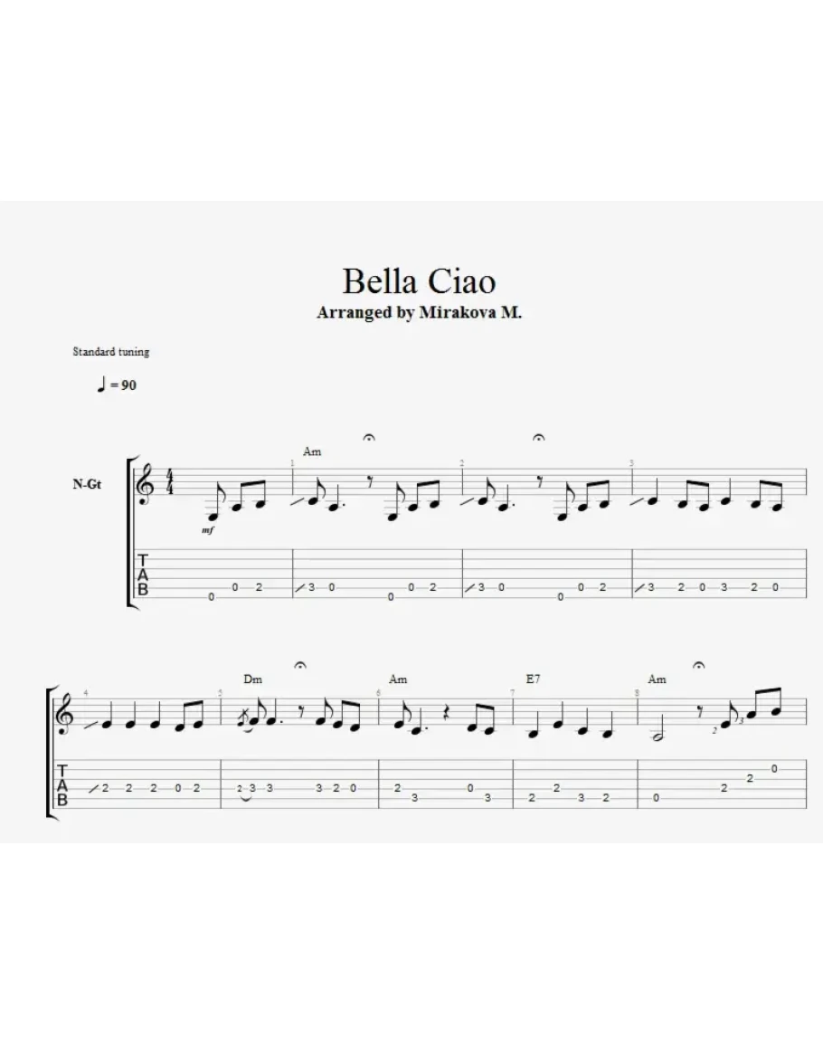 Авторская аранжировка для шестиструнной гитары от Марины Мираковой на народную итальянскую песню "Bella Ciao", исполнявшуюся участниками движения Сопротивления в Моденских горах во время Второй мировой войны и получившая широкую мировую известность в конце 1940-х годов.