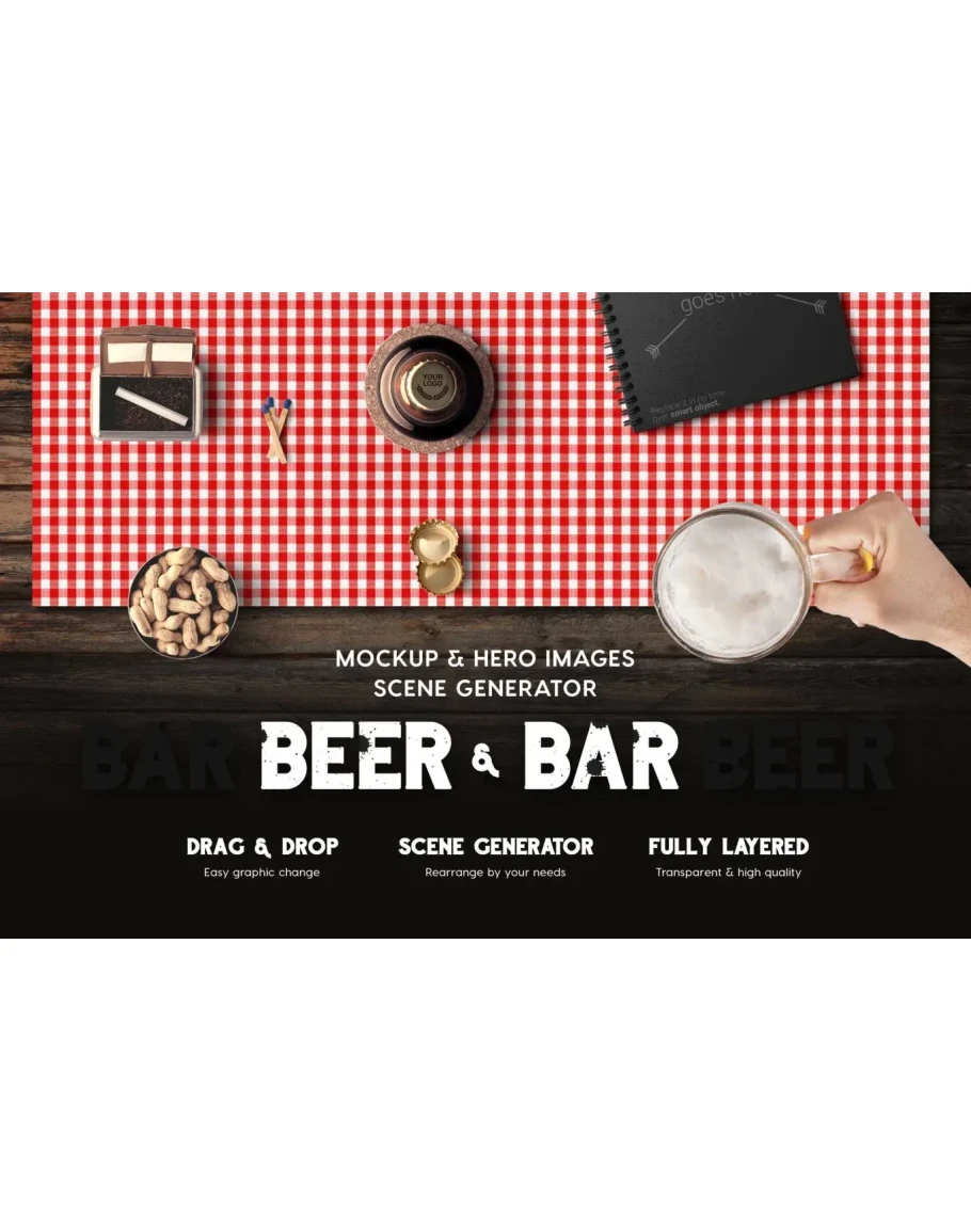 Beer & Bar mockup is scene generator that help you to create beautiful hero images for print and website headers. Just drag & drop HQ original photos into premade psd files and generate graphic in just few minutes.