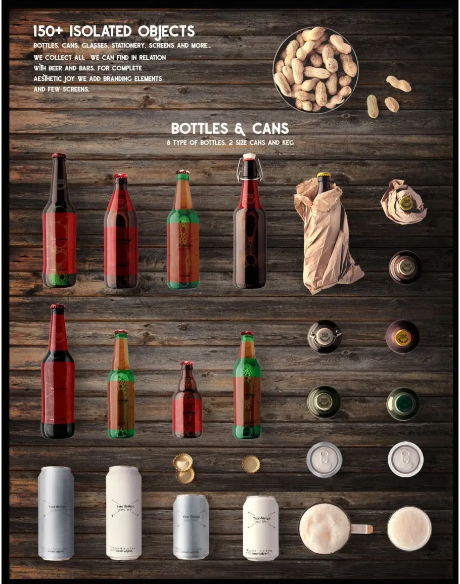 150+ isolated images – bottles, cans, stationary, screens, some snacks and more – all items we choose to help to combine any graphic in relation with beer. For complete aesthetic joy we add branding elements and three screens.