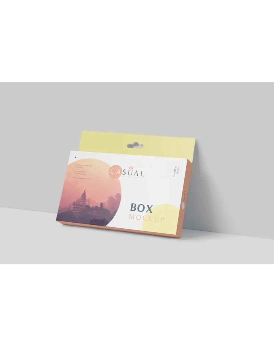 Use this professional box mockup - wide slim rectangle size with hanger to showcase your designs amazingly. You can add your designs to these mockups with a single click. You can also customize the shadows, effects and background using well-named layers.