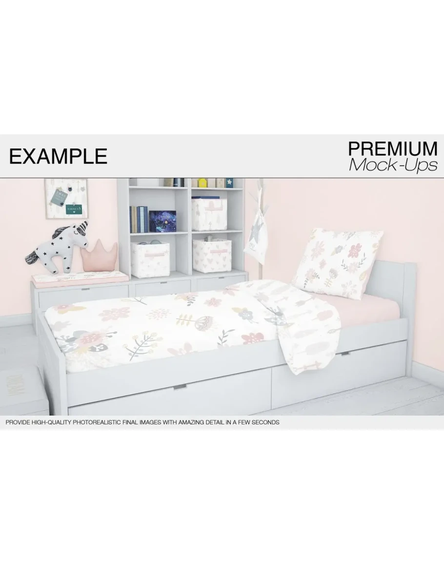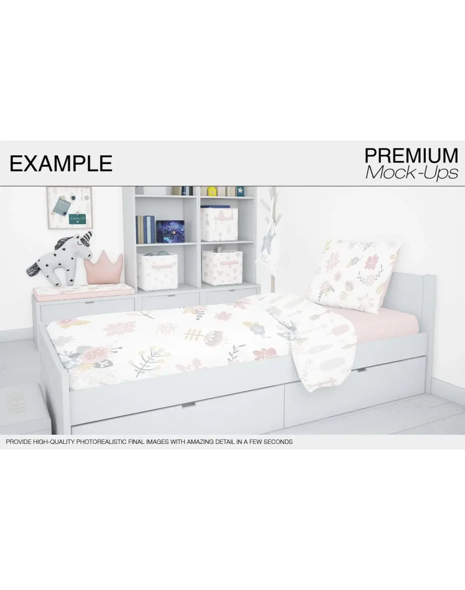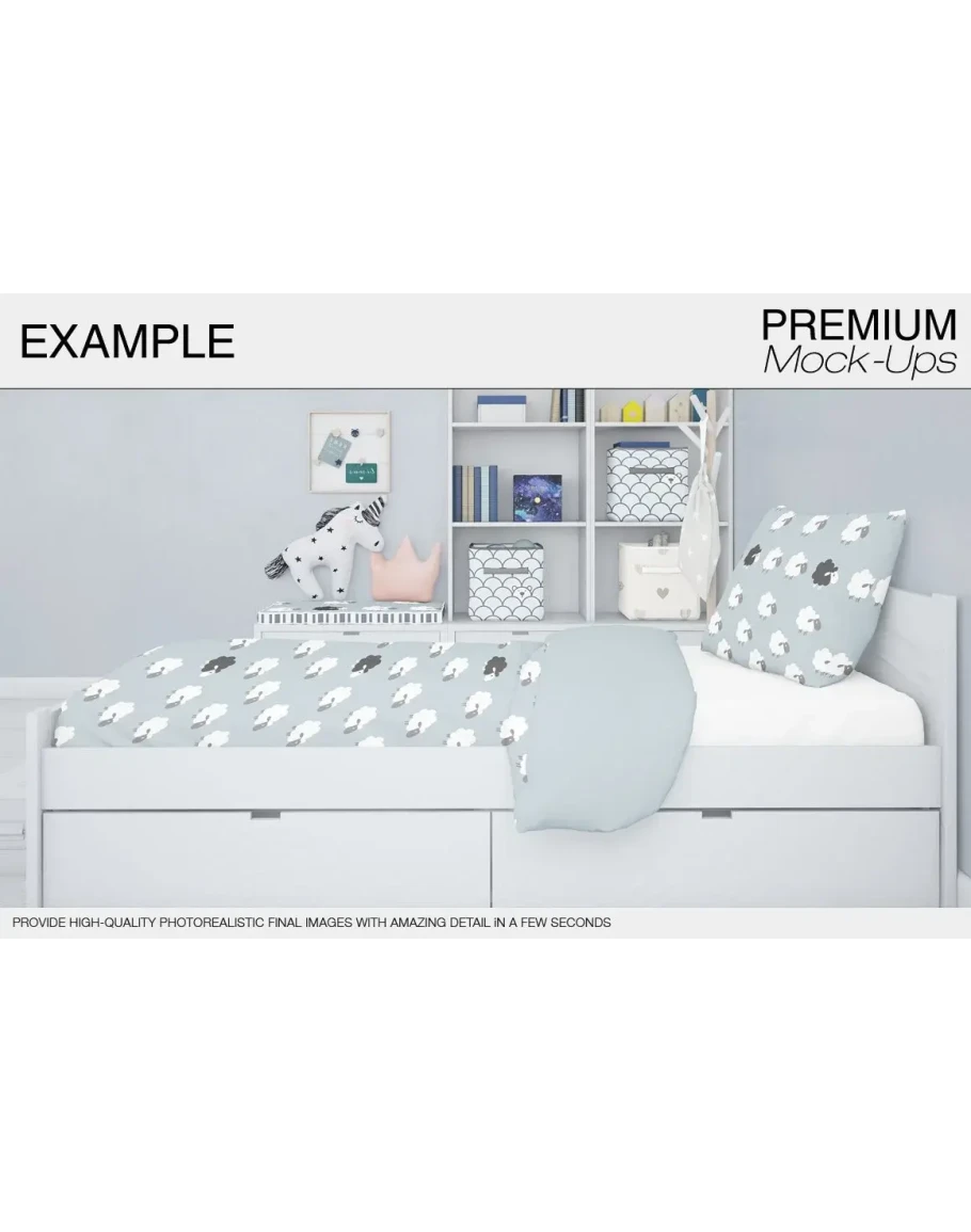 This Kids Bedding Mockup Pack allows you to quickly display your designs and layouts into a digital photo realistic showcase