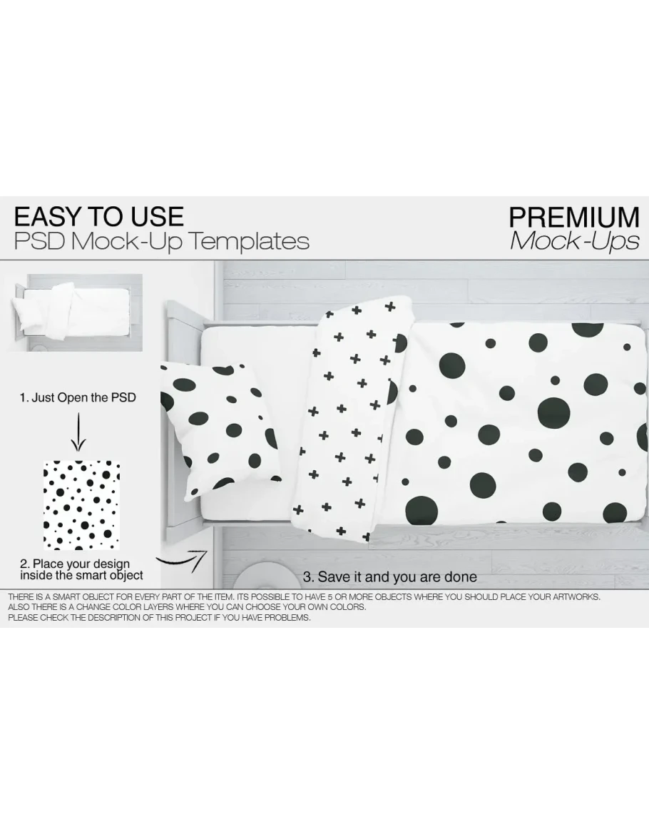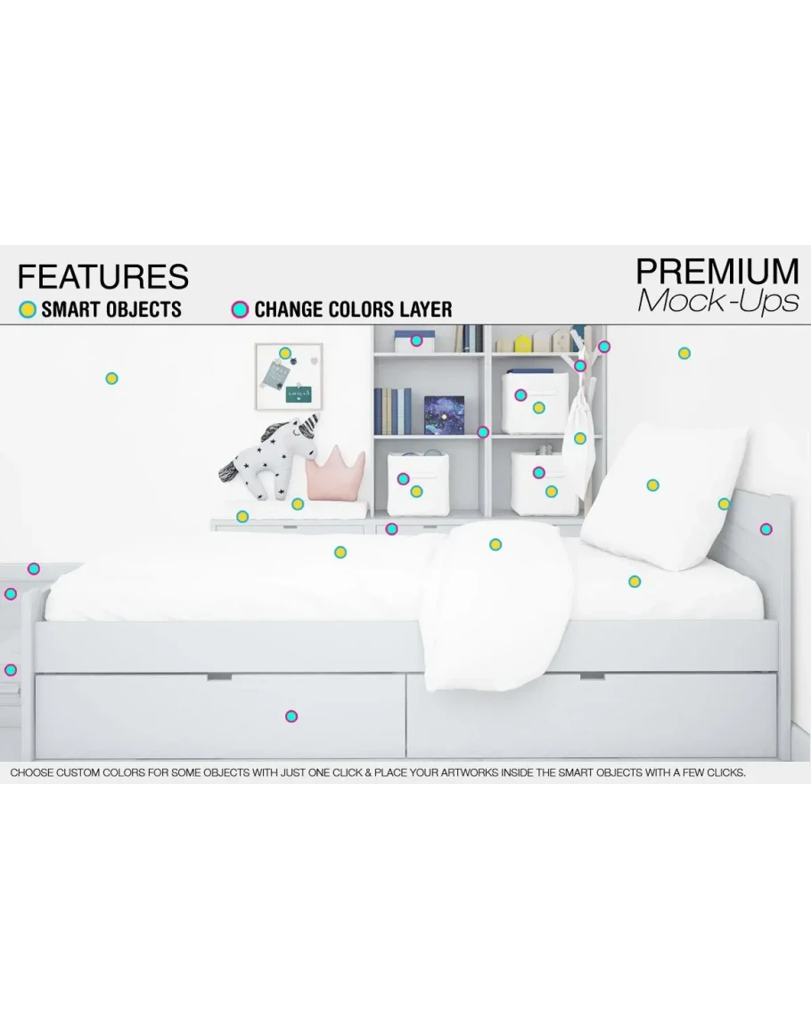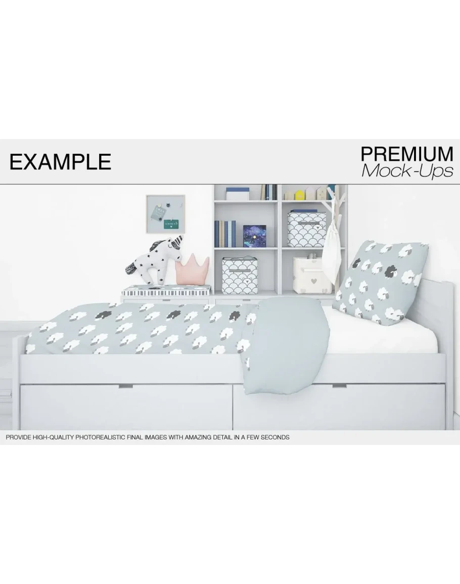 This Kids Bedding Mockup Pack allows you to quickly display your designs and layouts into a digital photo realistic showcase
