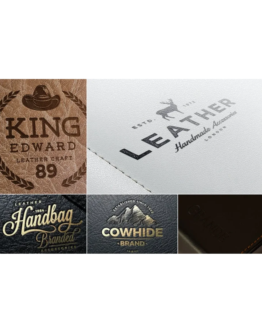 These leather logo branding mockups offer 5 different leather surfaces to show apparel branding logo designs. Just use smart object option to add your designs and showcase your logo designs with embossed, painted and gold foil effects.