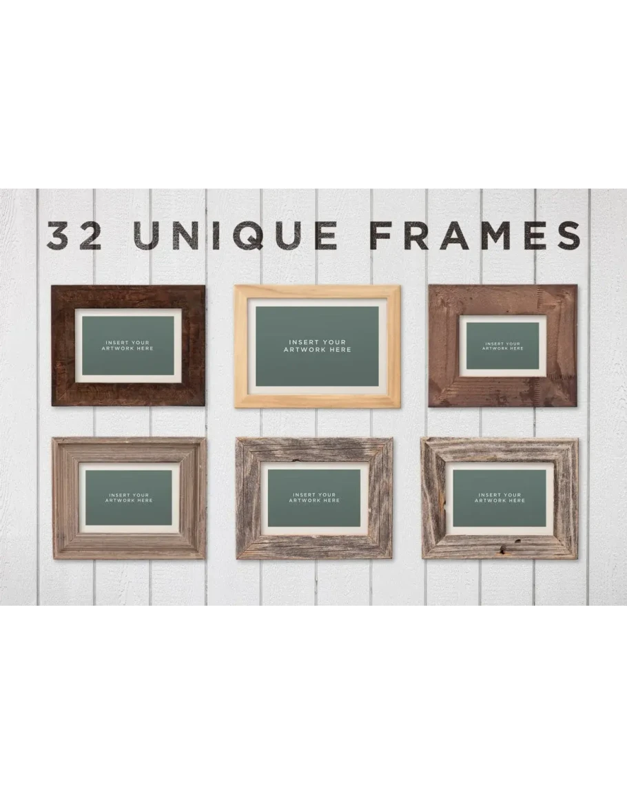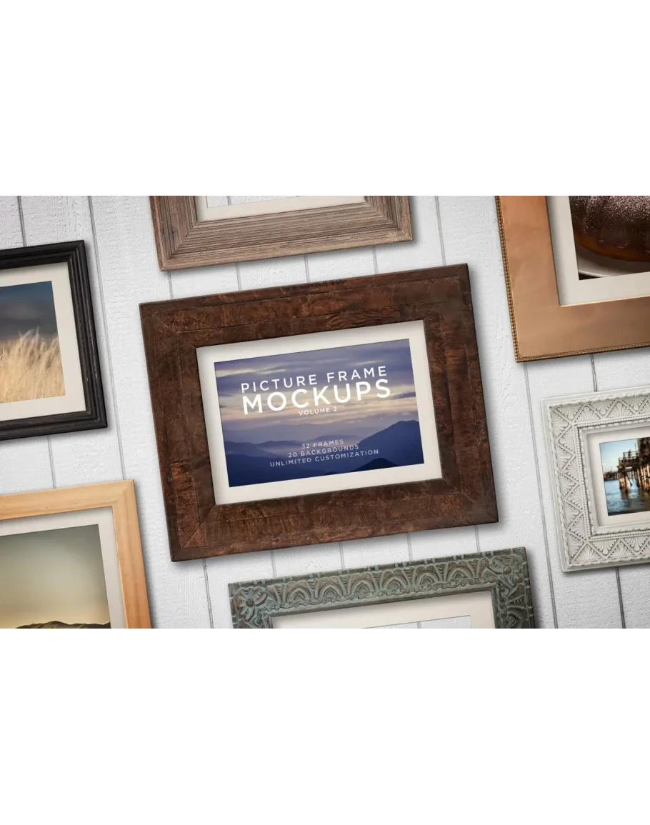 This picture frame mockup kit contains 32 unique frames, 20 different background textures, and is fully customizable.