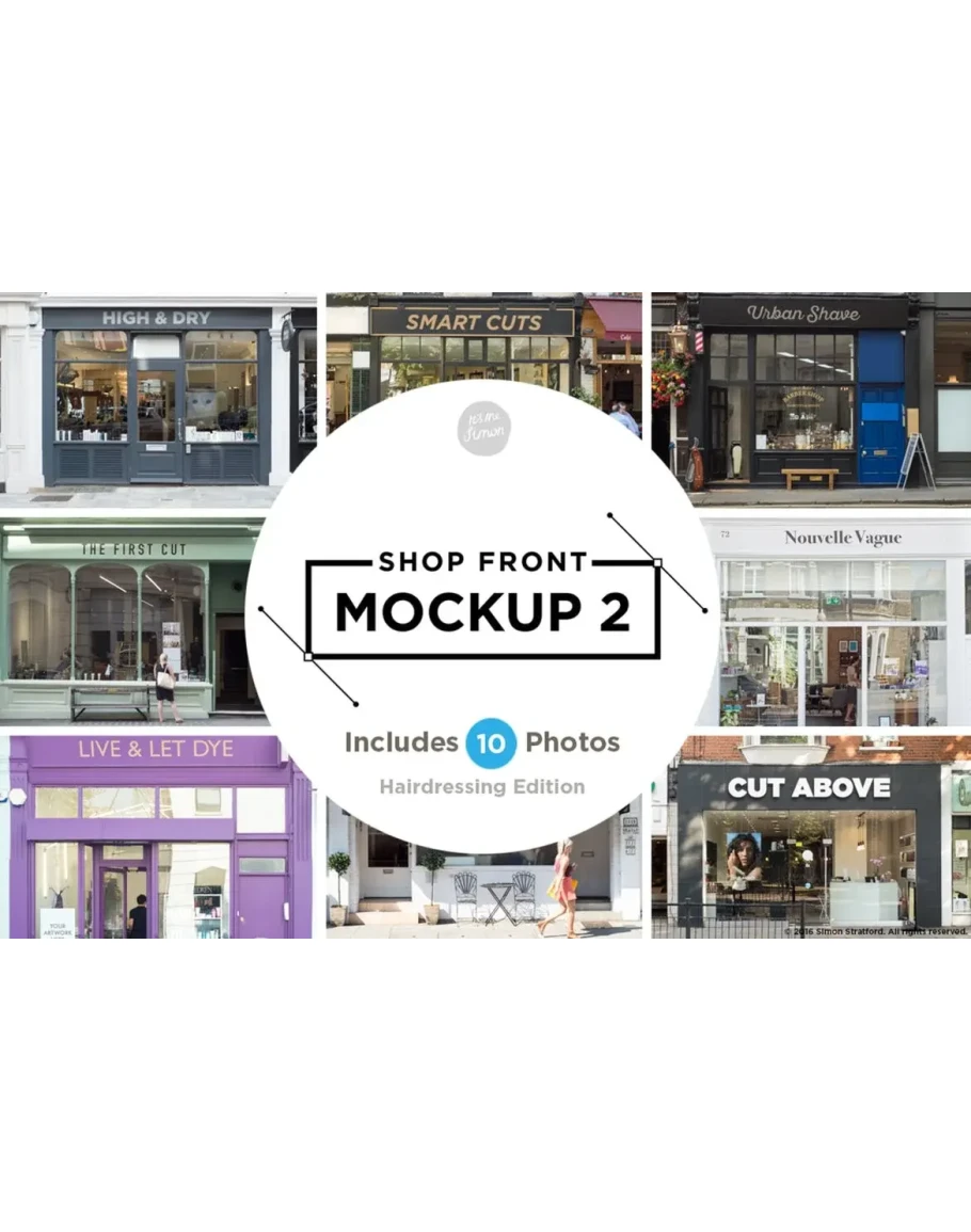 Shop facade mockups 2 A set of 10 high-resolution photos of real shop fronts. This pack is the hairdressing edition with a collection of traditional men’s barbers and modern salons.