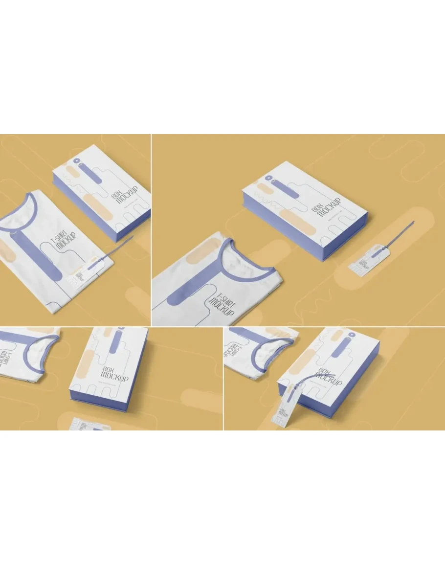 These t-shirt mockup templates come with a beautiful combination of t-shirt, label tag and packaging box. Offering 4 different arrangements and styles equipped with smart objects and layers. Using these tools, you can easily change the design, color, shadows, effects and background.