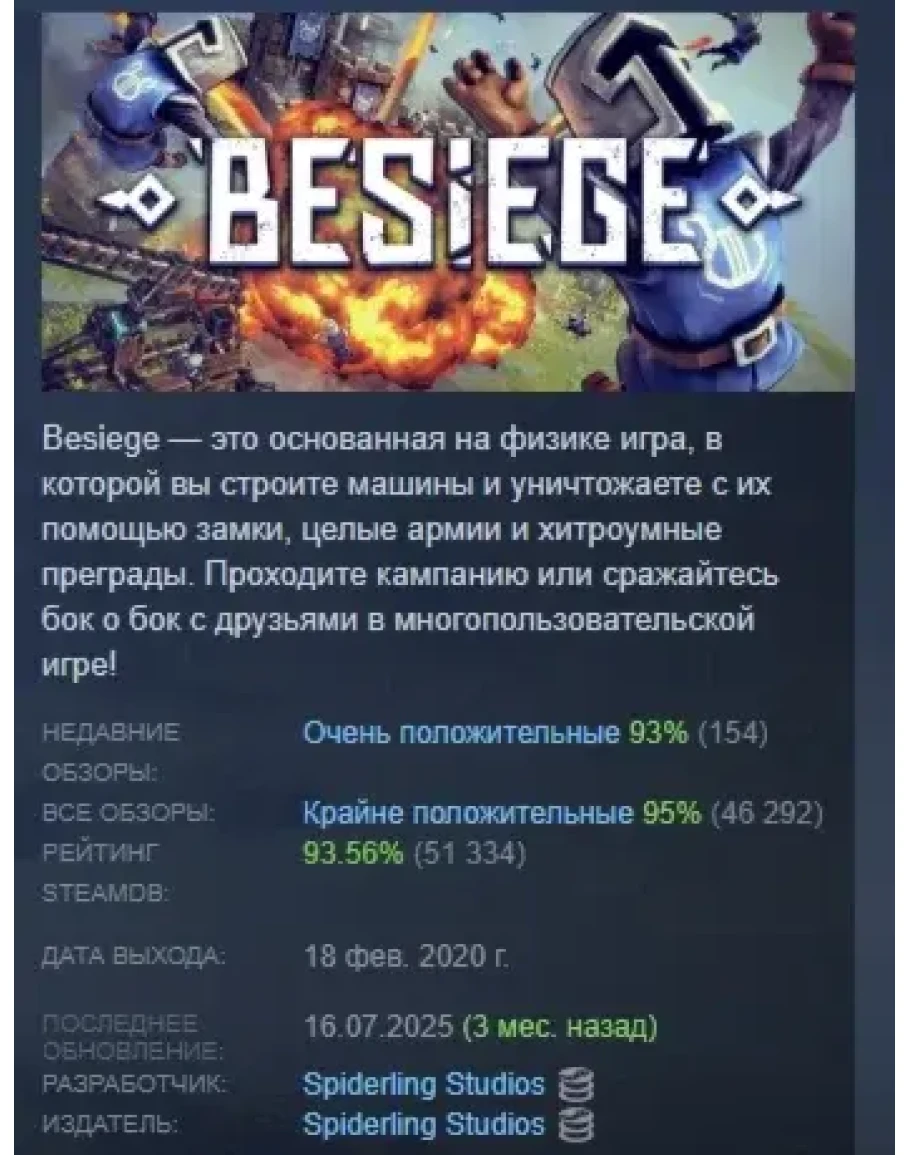 Besiege это идеальный микс конструктора и экшена: вы проектируете катапульты, танки, летающие крепости, а затем тестируете их на вражеских укреплениях. Интерфейс на русском делает игру доступной для всех, кто любит нестандартные решения и зрелищные взрывы. А с Besiege Steam Workshop вы сможете скачать 200 000+ машин от других игроков или похвастаться своими.