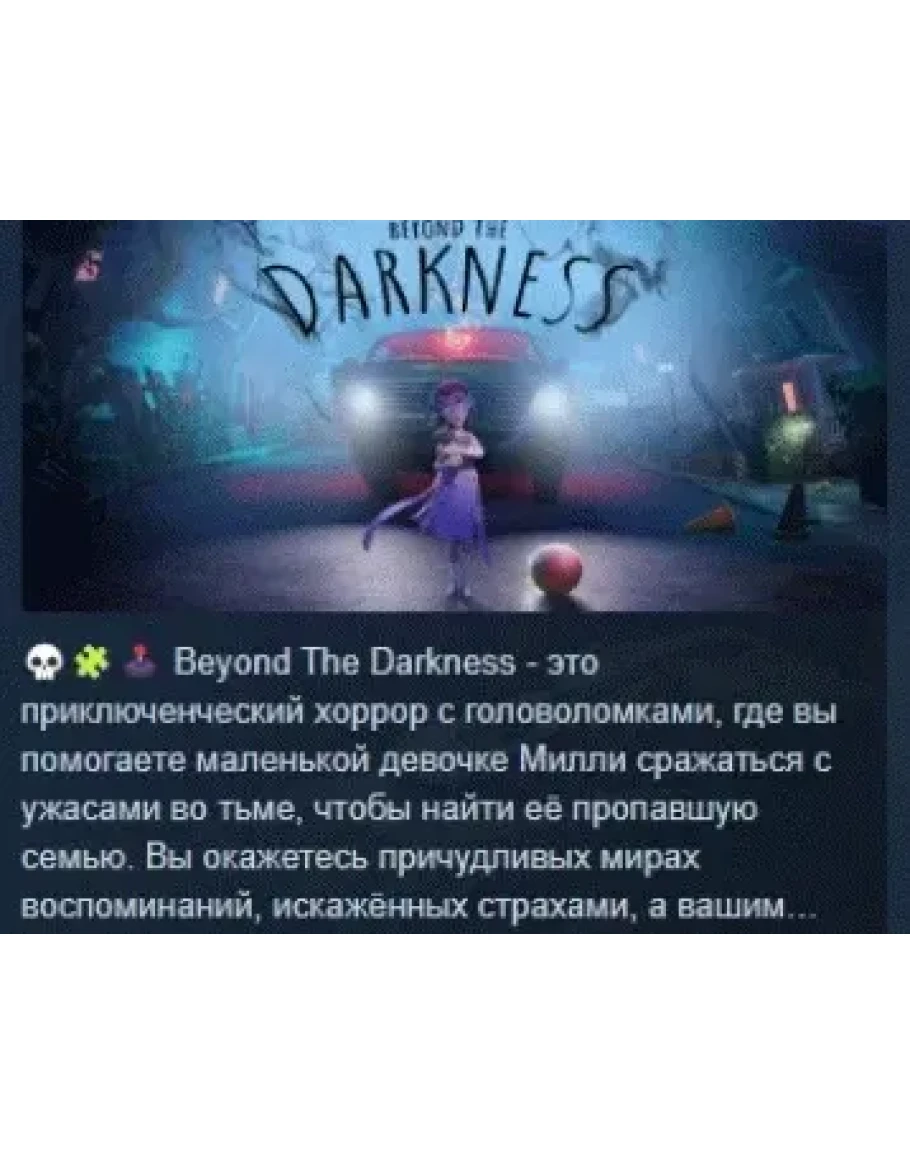 💀🧩🕹️ Beyond The Darkness - это приключенческий хоррор с головоломками, где вы помогаете маленькой девочке Милли сражаться с ужасами во тьме, чтобы найти её пропавшую семью. Вы окажетесь причудливых мирах воспоминаний, искажённых страхами, а вашим единственным оружием станет свет маленькой лампы…