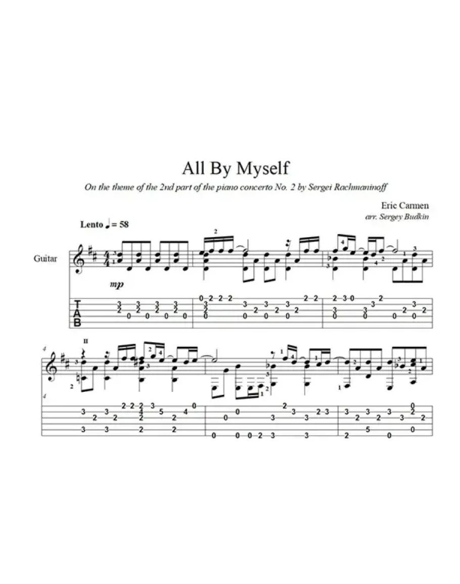 Аранжировка для гитары песни All By Myself, которую написал Eric Carmen на тему 2-ой части Второго фортепианного концерта Сергея Рахманинова.