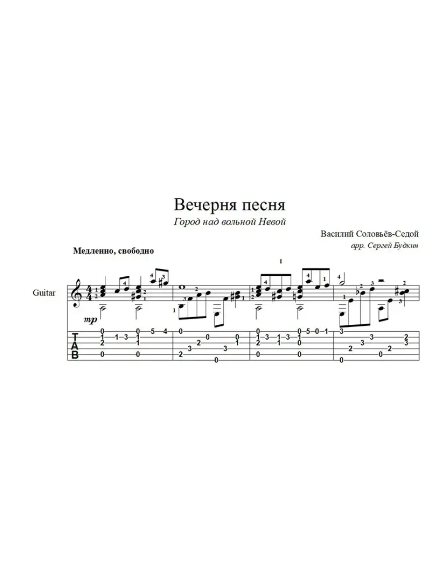 Аранжировка для гитары Вечерней песни Василия Соловьёва-Седого, известной по первым словам - Город над вольной Невой.