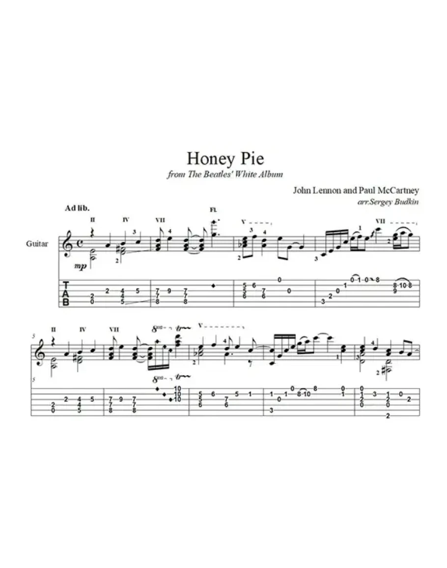 Аранжировка для гитары соло песни Пола МакКартни "Медовый пирог (Honey Pie)" из альбома "White Album" в исполнении группы "The Beatles".