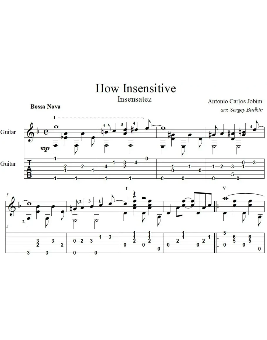Аранжировка для гитары пьесы Антонио Карлоса Жобима "How Insensitive" (Insensatez).