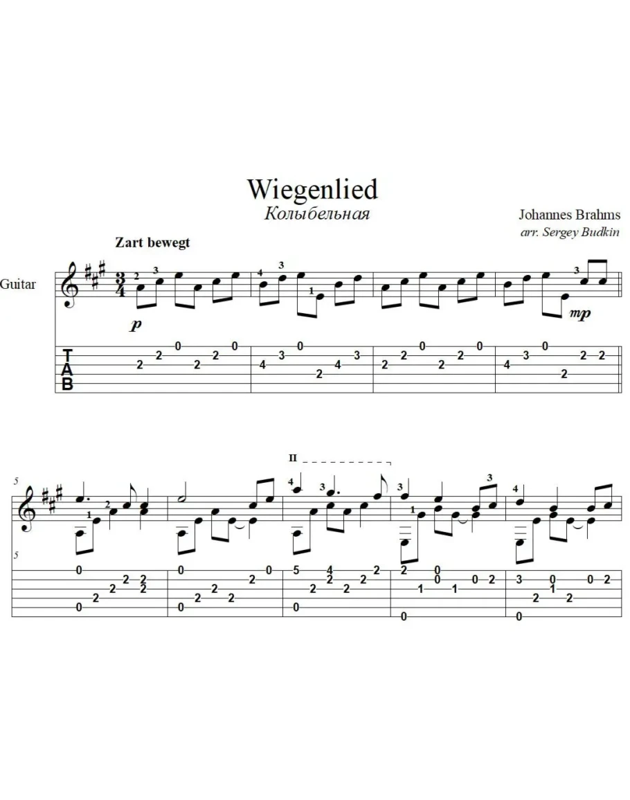 Аранжировка для гитары Колыбельной Иоганнеса Брамса.